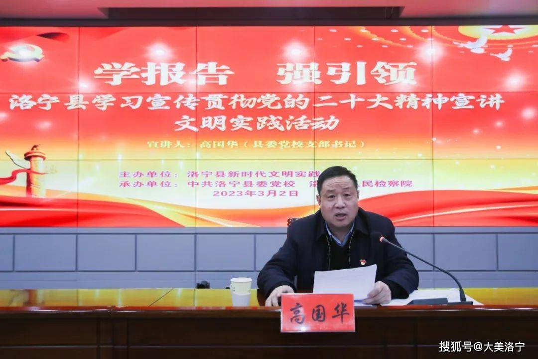 为深入学习贯彻党的二十大精神,广泛践行社会主义核心价值观,持续推进洛宁县精神文明建设走深走实,3月2日下午,洛宁县开展“学报告 强引领”新时代文明实践专题活动。特邀请县委党校支部书记高国华到洛宁县检察院,为该院全体干警专题宣讲党的二十大报告精神,该院党组书记、检察长陈乐、班子成员和全院干警参加。