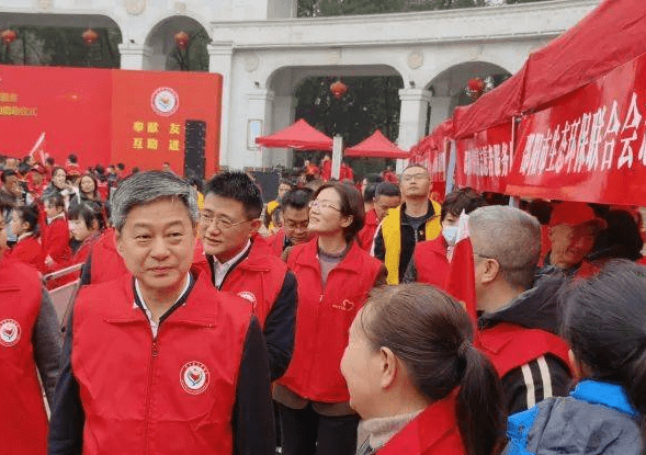 严华书记亲切地询问会长李志明:"你是哪个单位的?""生态环境保护志愿者联合会!""这个协会我知道,了不起!"严华书记竖起大拇指。