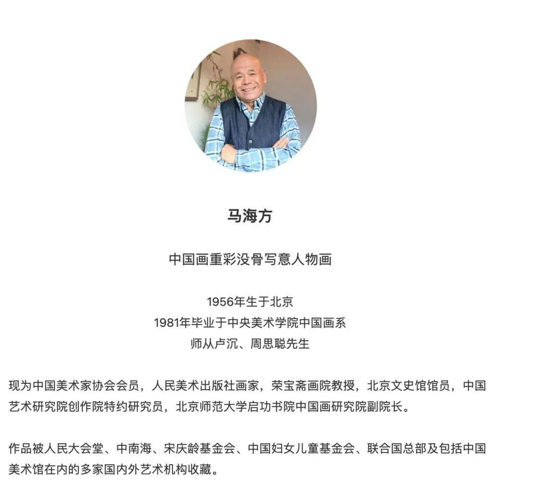 马海方,中国画重彩没骨写意人物画家。1956年生于北京1981年毕业于中央美术学院中国画系师从卢沉、周思聪先生现为中国美术家协会会员,人民美术出版社画家,荣宝斋画院教授,北京文史馆馆员,中国艺术研究院创作院特约研究员,北京师范大学启功书院中国画研究院副院长。作品被人民大会堂、中南海、宋庆龄基金会、中国妇女儿童基金会及包括中国美术馆在内的多家国内外艺术机构收藏。