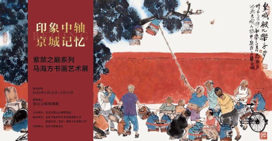 这次画展共精选了50余幅马海方先生近年来全新创作完成的没骨人物画代表作品,其中大部分作品都是首次亮相。景山公园作为明清两代皇家御苑,是北京中轴线申遗地标的重要组成部分,“北京中轴线申遗”不仅是利在当代、功垂千秋的人文壮举,更是向世界人民展现北京文化的重要契机。随着北京中轴线申遗进入“冲刺”阶段,作为具有代表性的京味儿画家,马海方先生为助力“北京中轴线申遗”创作了“重彩没骨绘中轴”系列作品,用笔墨再现中轴线上庄严恢弘皇家御苑建筑之美及平民百姓遛鸟下棋的人文意趣。作为古都文化和京味文化的摇篮,本次画展还得到了北京天桥演艺区的大力支持。展出将持续一个月的时间,其间马海方先生还将亲临现场与画友们登顶紫禁之巅创作采风。