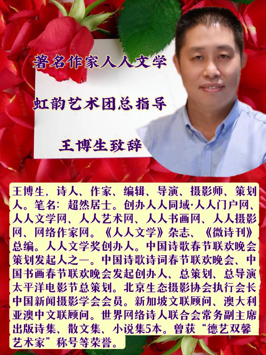 人人文学网总编、中国诗歌诗词春晚总策划、人人文学虹韵艺术团总指导王博生致辞: