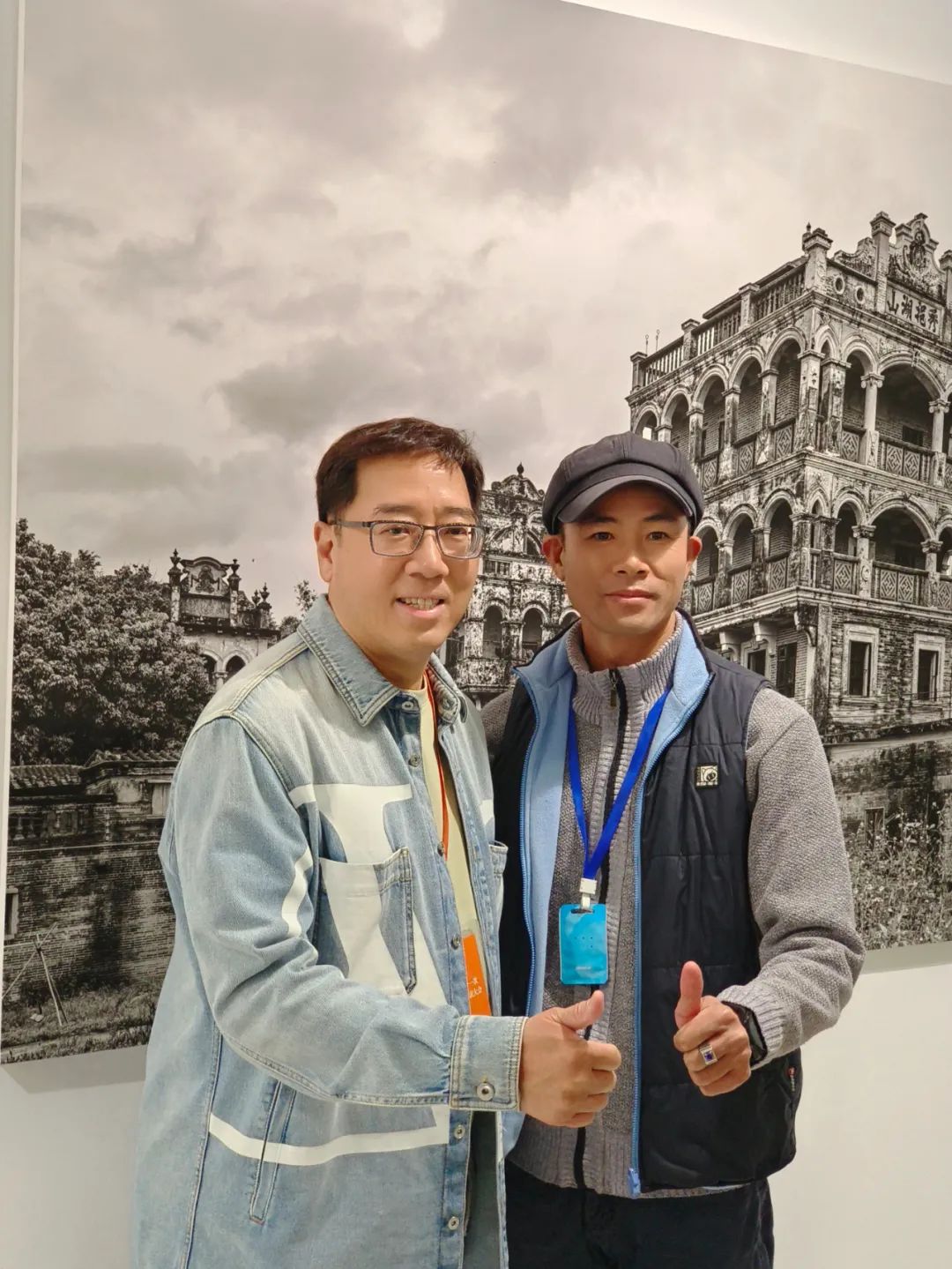 叶仕杰与笔者(右)为洋楼、碉楼点赞