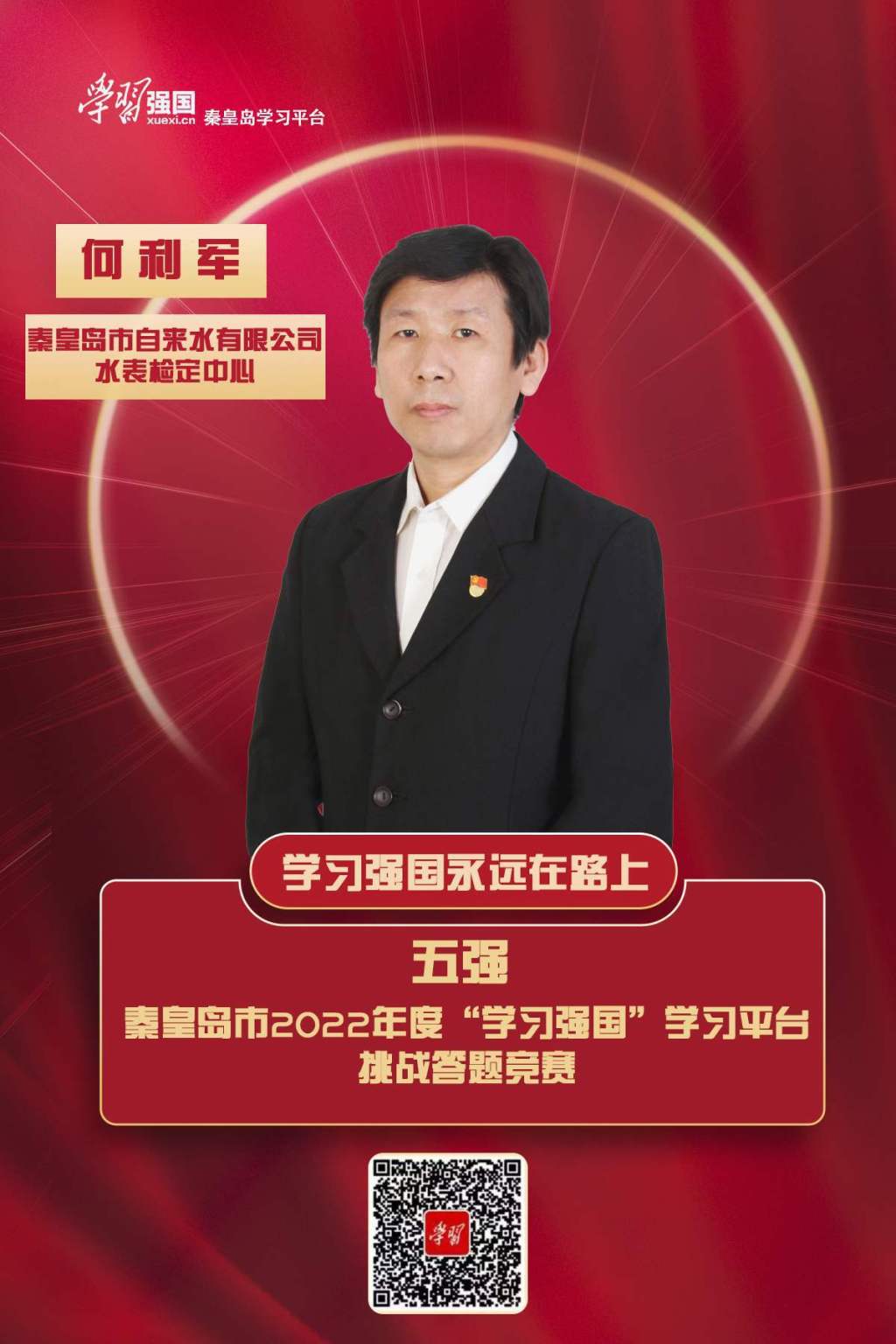 我将继续把用好“学习强国”当作习惯、乐趣坚持下去,以党的二十大精神为引领,进一步坚定理想信念,牢记初心使命,通过不断学习完善自我、超越自我,不断提升政治素养和业务能力,为服务群众,实现供水企业高质量发展贡献自己的力量。