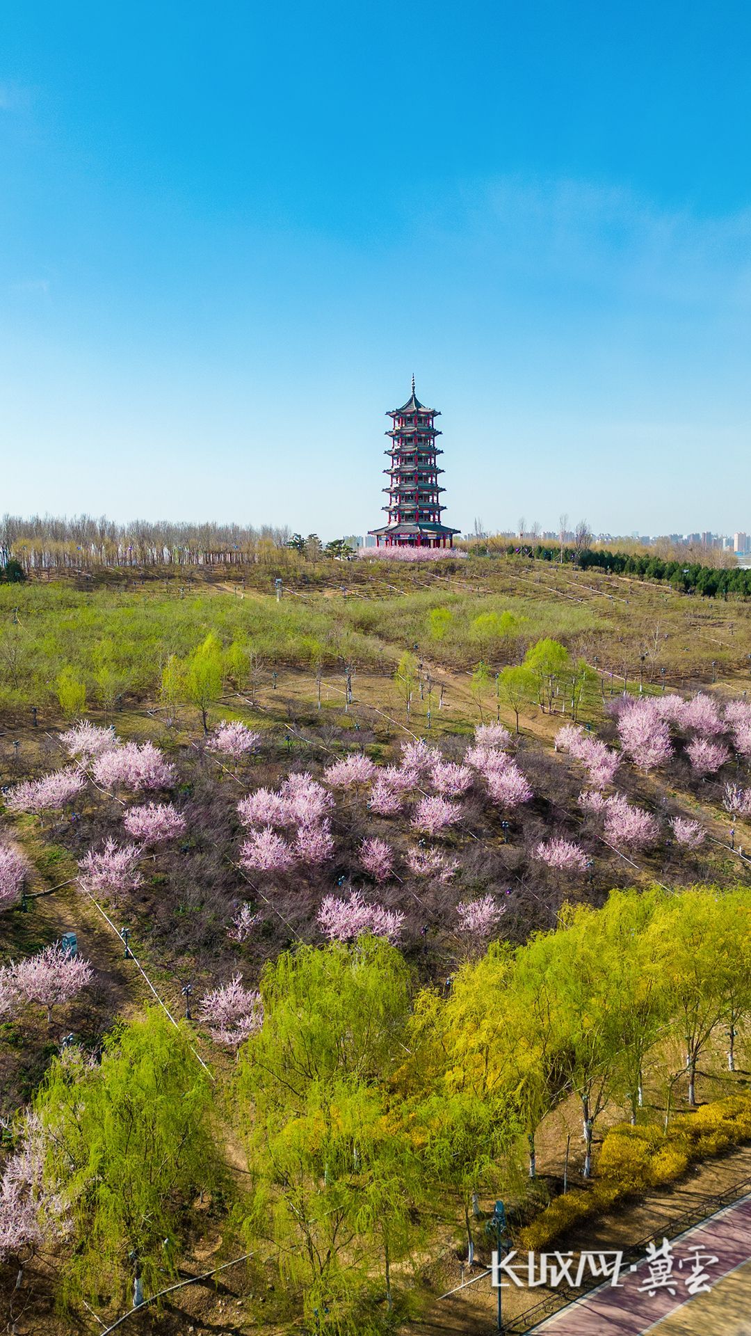滹沱河畔揽秀塔旁,一簇簇山桃花挂满枝头。长城网·冀云客户端记者 康义涵 摄