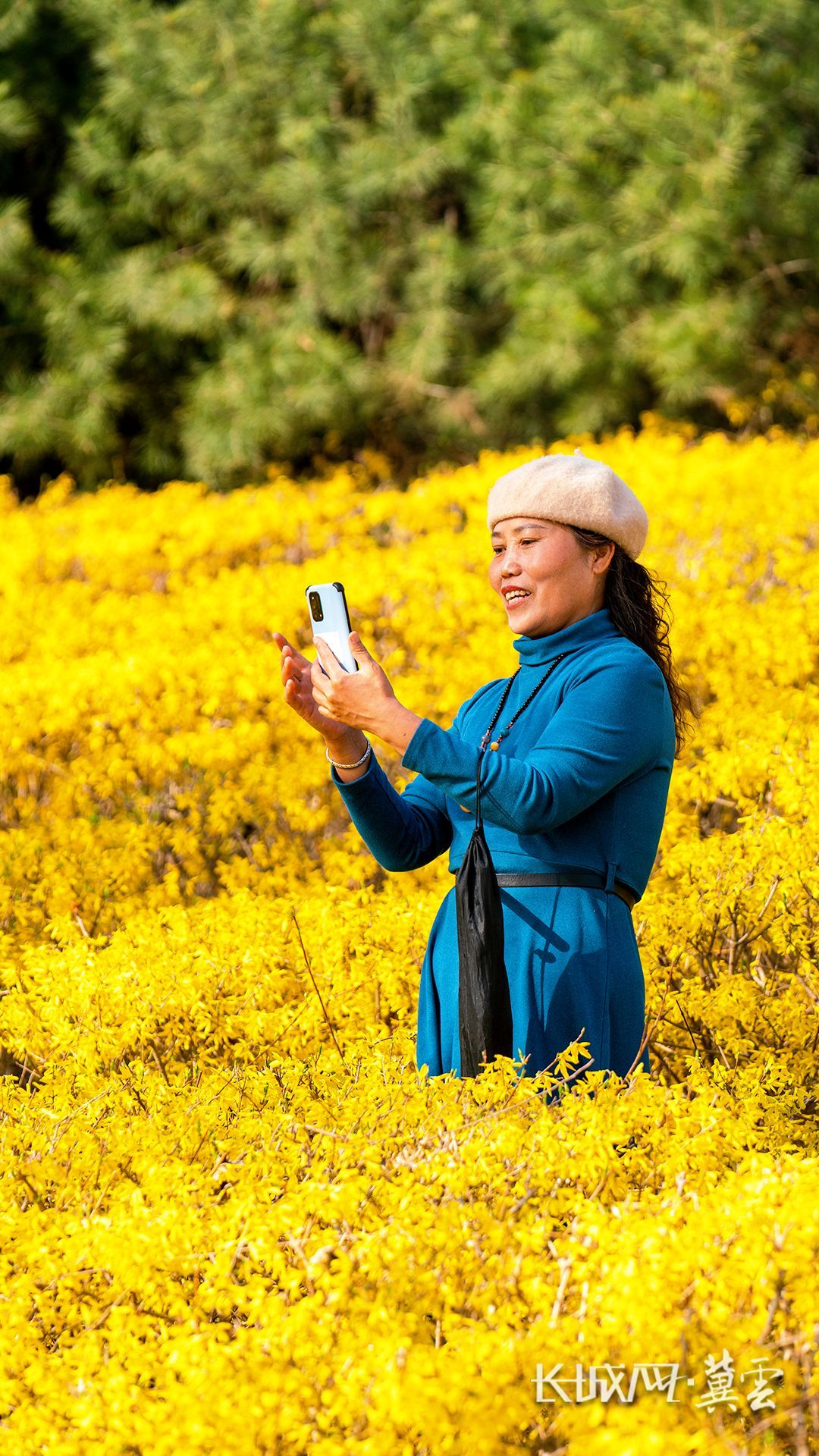市民在城市水系旁的连翘花丛中拍照留念。长城网·冀云客户端记者 康义涵 摄