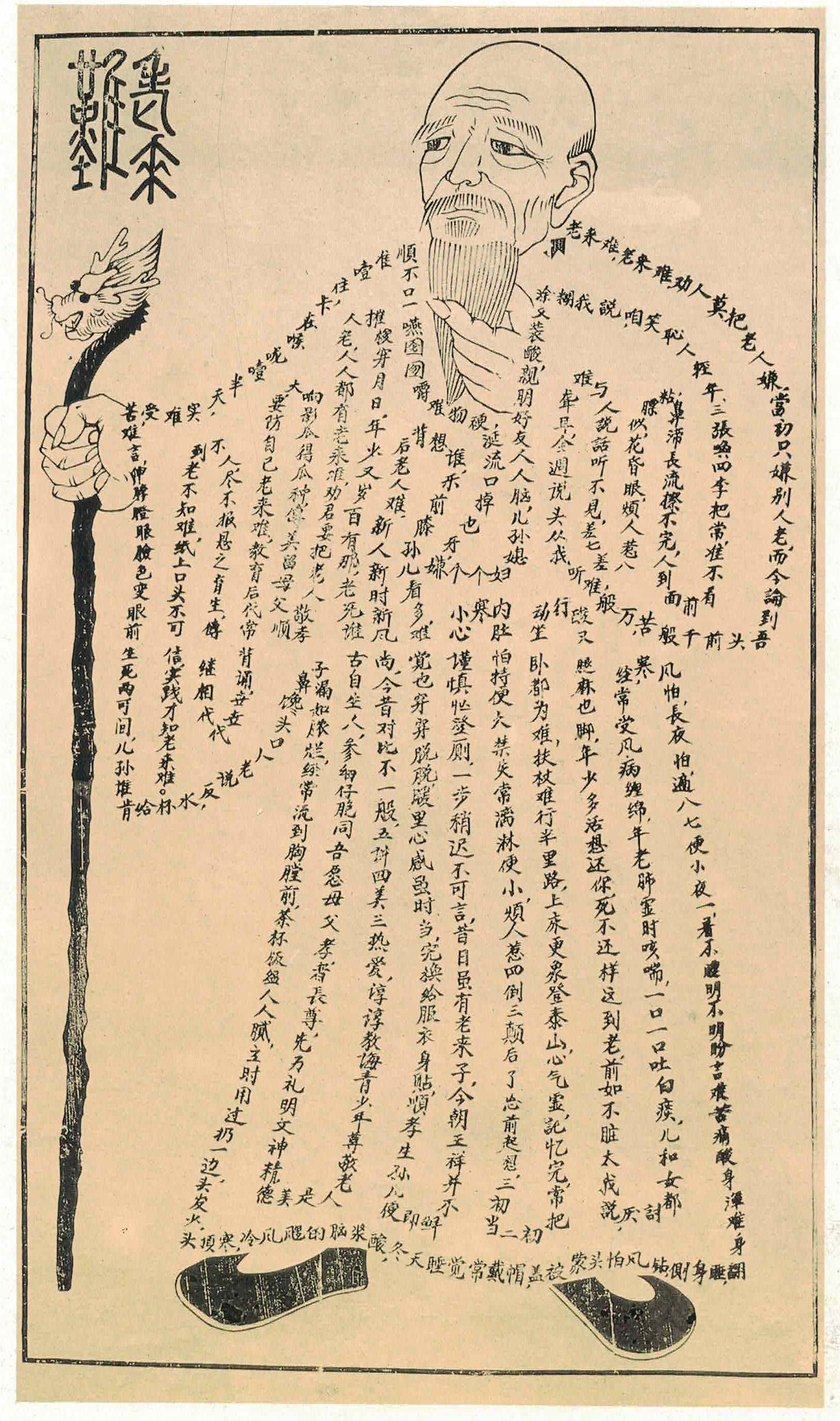武强年画《老来难》仿效年画中常见的“花鸟字”形式,用文字勾勒出一个老人的形象。老人一手捋着胡须、一手拄着拐杖,构成身体的文字仿佛向后代诉说着“人老后的艰难”,劝人要孝敬老人、尊重老人,同时启发晚辈,人人都会变老,孝敬老人就是尊重自己。这幅年画,既有可读的文字,又有可视的形象,图文并茂,别具一格。