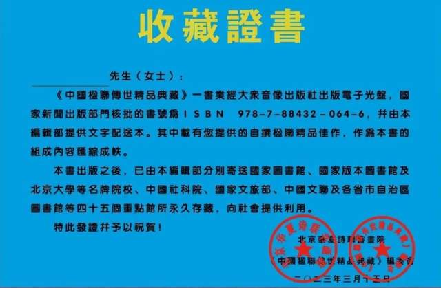 由北京华夏诗联书画院倡议组编的《中国楹联传世精品典藏》(首卷)已由大众音像出版社出版光盘,国家新闻出版部门的书号是:ISBN 978-7-88432-064-6。除光盘之外(本院配发文字版本),并将其存入国家图书馆、名牌大学及各省市自治区图书馆等45个馆所。