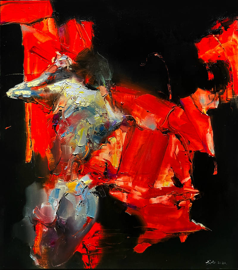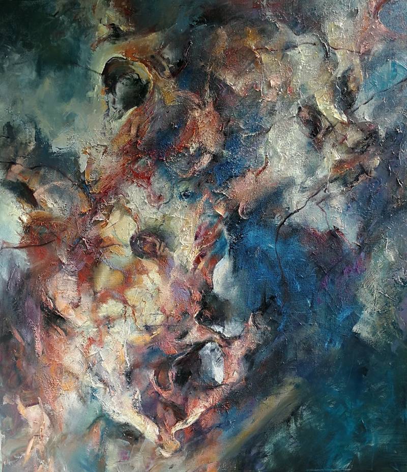 在他的作品中,深藏着一个人或一群人的孤独,虽然我认为很多时候孤独是一种美德,或许还是一种批判,在他的画作深处,所表达出来的多是人与人之间貌合神离却又挣脱不了的绝望。他是一个悲观主义者吗?所以作品清晰地表现出了人在复杂的现实社会中的异化。就作品本身而言,是介于抽象之外的忘乎所以。凸显出抽象中的具象,具象中的抽象。并把现实演化到无限的想象空间中,映衬出现实的不合逻辑。是想逃离却又经受不住这样的诱惑,是残忍的赤裸裸中时隐时现的自己,是真实与假想之间的一场肉搏战,是想在某种悖论中找到一种平衡的内心独白!