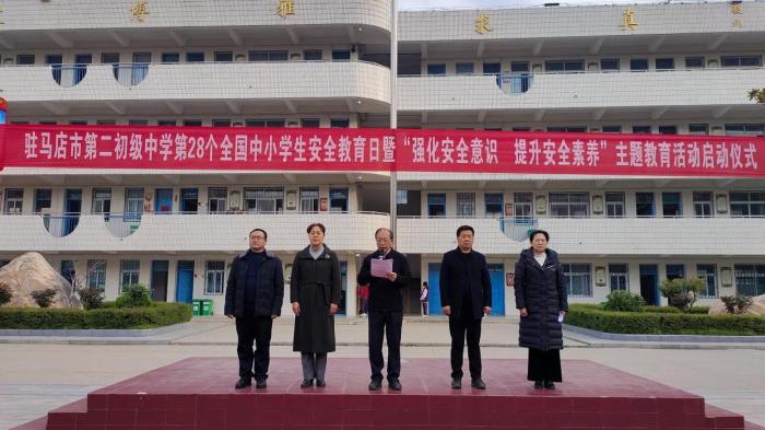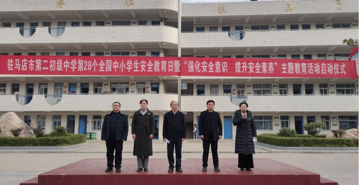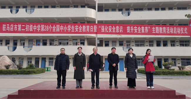 无危则安,无缺则全。2023年3月27日是第28个全国中小学生安全教育日。驻马店市第二初级中学在升国旗仪式后,隆重举行“强化安全意识,提升安全素养”主题教育活动启动仪式。市二中党委书记、校长梁宗京、副校长胡向红、许可、何中永出席会议,政教主任李芳主持会议。