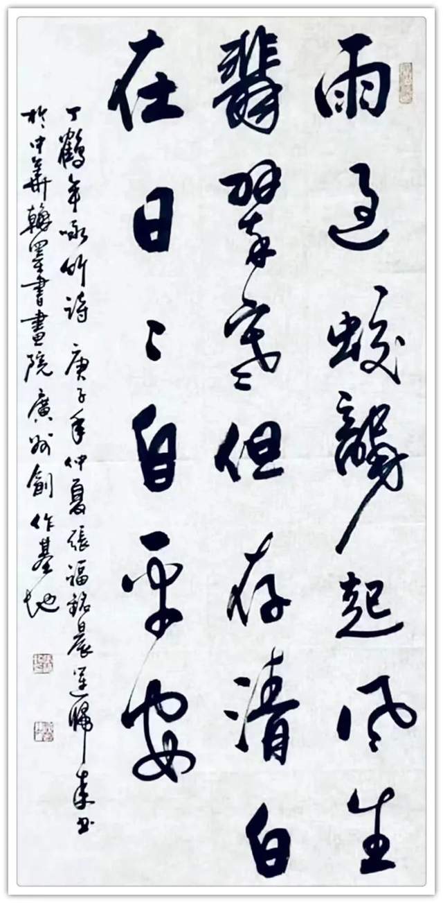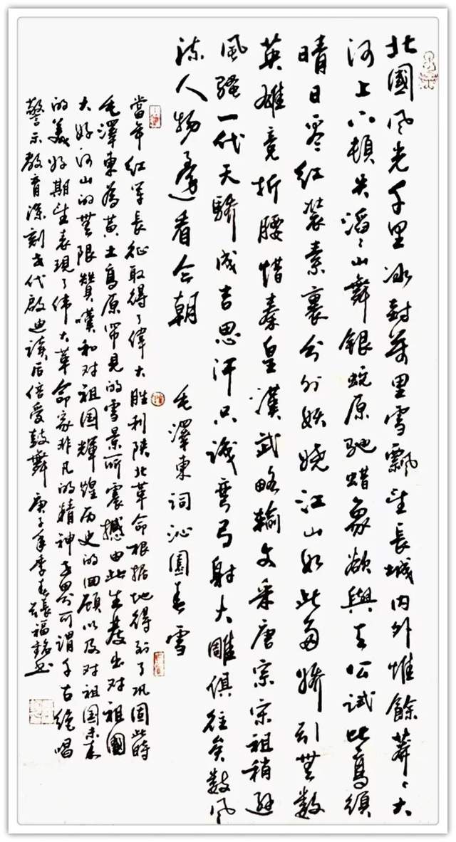 文武兼备,书画双修。作為歐陽中石大師的弟子,張先生书法线条造型的意识相当强烈,一笔拉过来,如临危居高,作高低有趣。一笔纵过去,如虬龙蜿蜒,写牵丝映带。笔与手合,手向心师,经过激楚浪以成文的表达,写出了小草千字文的铁点银钩,亦可以把兰亭序的千变万化表达得出神入化。技达精时谓之巧,艺到峰时名为妙。先生之书法亦如丹青创作,巧妙兼生,功在三山巅,佳谈八方誉!