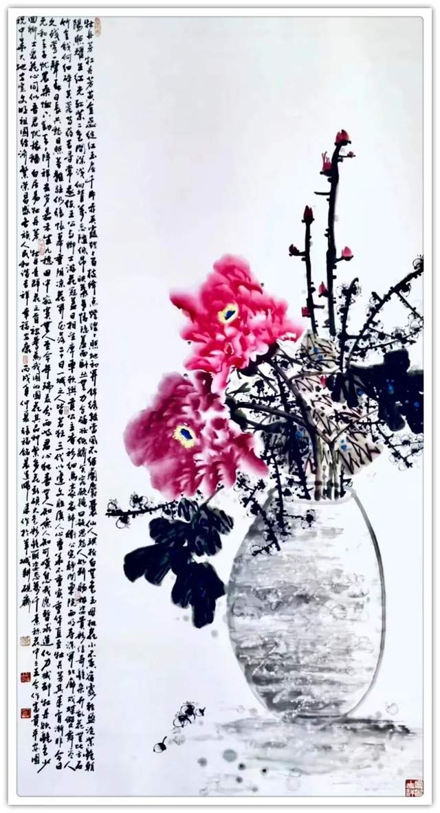 同样,他画其他花鸟作品也是文武兼备的证见!笔墨铿锵写意富贵牡丹,非仅富贵也!最有雄迈品!铁笔塑铁筋,雄墨写雄魂,骨法用笔,应物象形!再经过随类赋彩,就把牡丹画得既有君子之修,也有侠者之勇!他的画法刚则万分刚猛,雄则百倍雄强,给观赏者塑造起一个可以感受震撼力的艺术空间。在这个空间里游目骋怀,必然会心感铮铮!浓墨重彩,浑厚华滋,无限的审美张力,令他成为画坛的铁流派。唯有在军中得到身心熔锻,方得笔墨如此峥嵘!