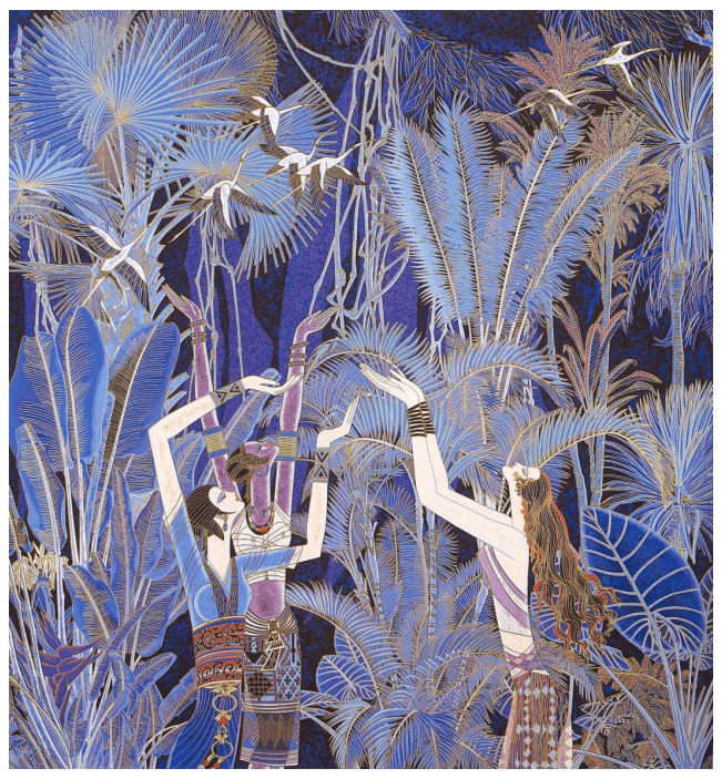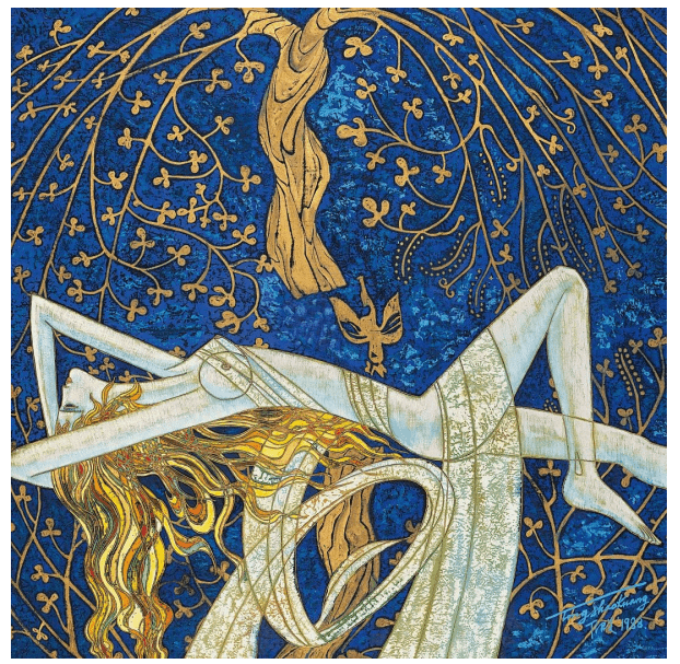 一幅名为《仲夏夜之梦》,丁老师以深蓝色为基调,用一排高耸的棕榈树作背景,一个长发少女在莲花座裸女喷泉下祈祷……以一浓一淡的银色光勾勒出两个女体的形态,一个肉体的灵魂与一个艺术的灵魂在月下的泉水中交融,自然地散发出神秘色彩和诗情画意,恍如一曲“最幸福的音乐家”门德尔松的作品。
