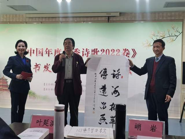 解放军艺术学院文学系原主任、解放军出版社原社长峭岩多年来一直关心支持本书的出版,每年都热情提供作品。他将亲笔书写的书法作品“诗海撷萃传远留香”赠送给新华出版社;诗人陆健不但将自己历年来创作的27本诗集赠送给海淀图书馆,还以篆书题写了“中国年度优秀诗歌”书名;诗人郭宗忠也同台展示书法作品致贺。