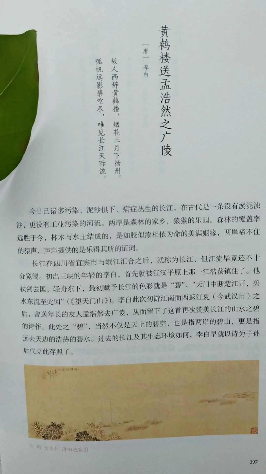 今日已诸多污染、泥沙俱下、病症丛生的长江,在古代是一条没有淤泥浊沙,更没有工业污染的河流。两岸是森林的家乡,猿猴的乐园。森林的覆盖率远胜于今,林木与水土结成的,是如胶似漆相依为命的美满姻缘,两岸啼不住的猿声,声声提供的是乐得其所的证词。长江在四川省宜宾市与岷江汇合之后,就称为长江,但江流毕竟还不十分宽阔。初出三峡的年轻的李白,首先就被江汉平原上那一江浩荡镇住了。他杖剑去国,轻舟东下,最初赋予长江的色彩就是“碧”,“天门中断楚江开,碧水东流至此回”(《望天门山》)。李白此次初游江南而西返江夏(今武汉市)之后,曾送年长的友人孟浩然去广陵,从而留下了这首再次赞美长江的山水之碧的诗作。此处之“碧”,当然不仅是天上的碧空,也是指两岸的碧山,更是指远去天边的浩荡的碧水。过去的长江及其生态环境如何,李白早就以诗为子孙后代立此存照了。