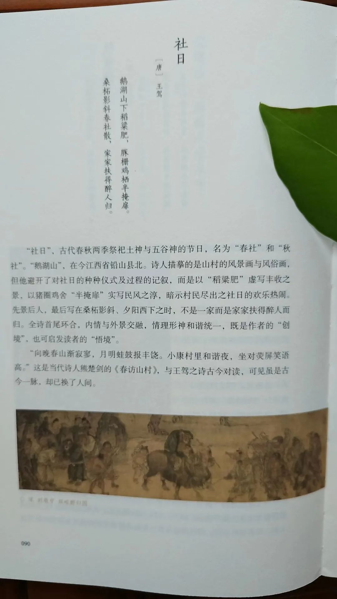 “社日”,古代春秋两季祭祀土神与五谷神的节日,名为“春社”和“秋社”。“鹅湖山”,在今江西省铅山县北。诗人描摹的是山村的风景画与风俗画,但他避开了对社日的种种仪式及过程的记叙,而是以“稻粱肥”虚写丰收之景,以猪圈鸡舍“半掩扉”实写民风之淳,暗示村民尽出之社日的欢乐热闹。先景后人,最后写在桑柘影斜、夕阳西下之时,不是一家而是家家扶得醉人而归。全诗首尾环合,内情与外景交融,情理形神和谐统一,既是作者的“创境”,也可启发读者的“悟境”。“向晚春山渐寂寥,月明蛙鼓报丰饶。小康村里和谐夜,坐对荧屏笑语高。”这是当代诗人熊楚剑的《春访山村》,与王驾之诗古今对读,可见虽是古今一脉,却已换了人间。
