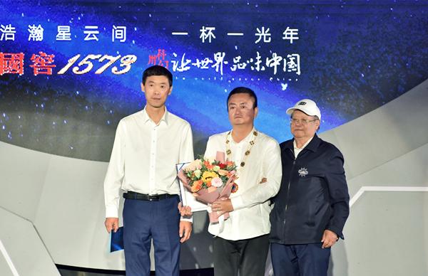 Tianrui Shuofu (C), winner of the gold award for best sci-fi novel at the 14th Chinese Nebula Awards, poses for a photo with Liu Cixin (L), prominent Chinese sci-fi writer, and Li Yong (R), deputy general manager of event sponsor Luzhou Laojiao, at a gala in Guanghan, Sichuan province, May 13, 2023. [Photo courtesy of EV/SFM]