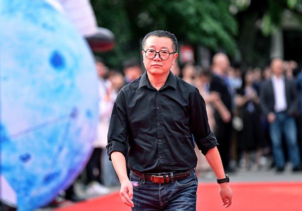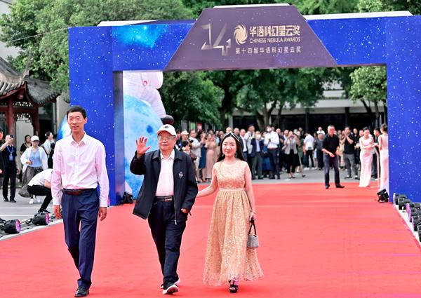 Chinese sci-fi writer Liu Cixin walks the red carpet before the award gala in Guanghan, Sichuan province, May 13, 2023. [Photo courtesy of EV/SFM]