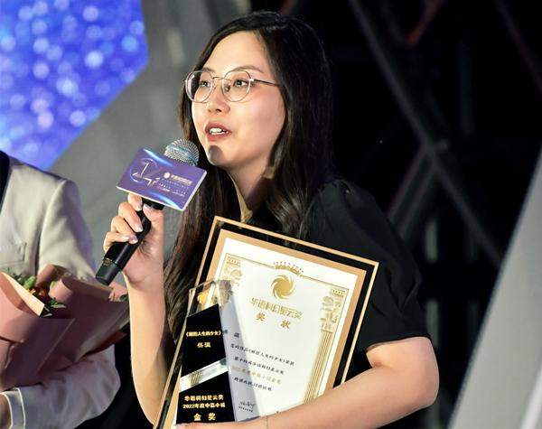 Sci-fi writer Zhou Wen delivers her acceptance speech for the best novella prize with "The Girl with a Restrained and Released Life" at the 14th Chinese Nebula Awards gala in Guanghan, Sichuan province, May 13, 2023. [Photo courtesy of EV/SFM]