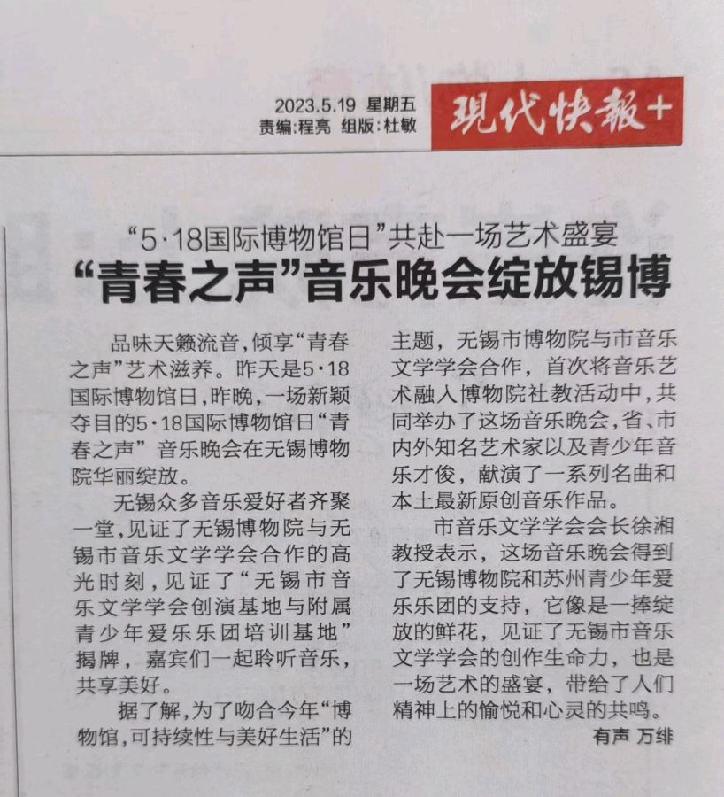据了解,为了吻合今年“博物馆,可持续性与美好生活”的主题,主办方无锡市博物院与无锡市音乐文学学会合作,首次将音乐艺术融入博物院社教活动中,共同举办了这场内涵丰富、高规格高水准的“青春之声”音乐晚会,省、市内外知名艺术家以及青少年音乐才俊,同台献演了一系列名曲精粹和本土最新优秀原创音乐作品。