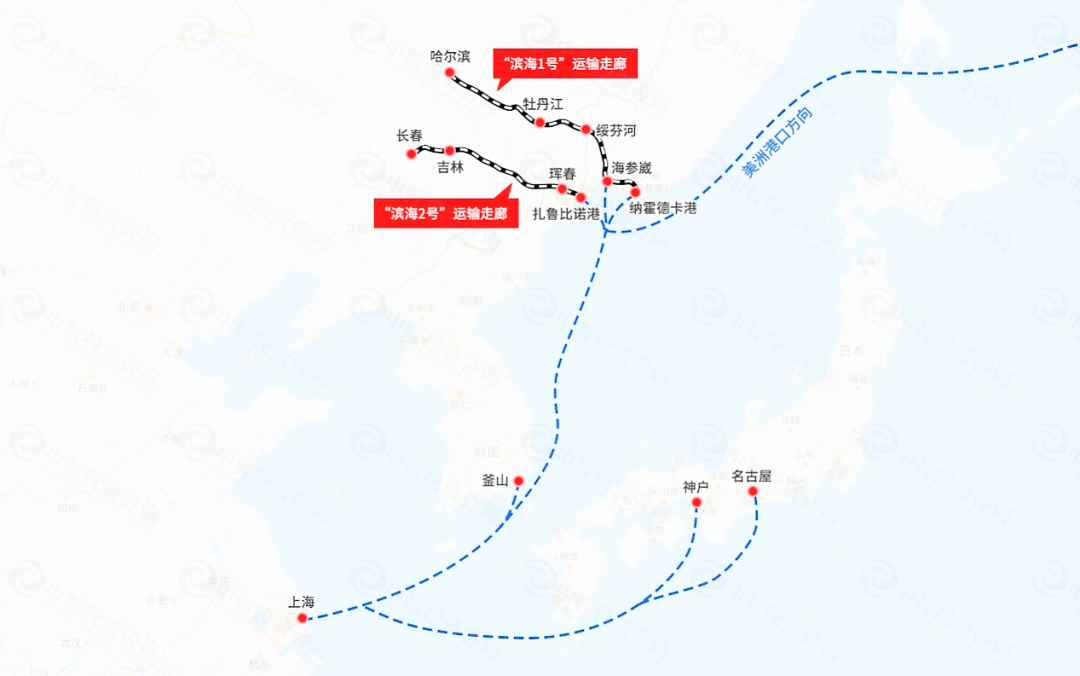 幸运的是,中俄两国在变动的国际竞争环境中,意识到了联手合作的重要性。2016年,双方年开始实施“滨海1号”和滨海2号”国际交通运输走廊。其中,“滨海1号”国际交通走廊是指:哈尔滨—牡丹江—绥芬河—格拉捷阔沃(或东宁—波尔塔夫卡)—乌苏里斯克—符拉迪沃斯托克港(东方港、纳霍德卡港)—海上航线,主要是针对黑龙江省;“滨海2号”国际交通走廊是指:长春—吉林—珲春—克拉斯基诺(珲春—马哈力诺、珲春—卡梅绍娃娅)—扎鲁比诺港—海上航线,主要针对吉林省。