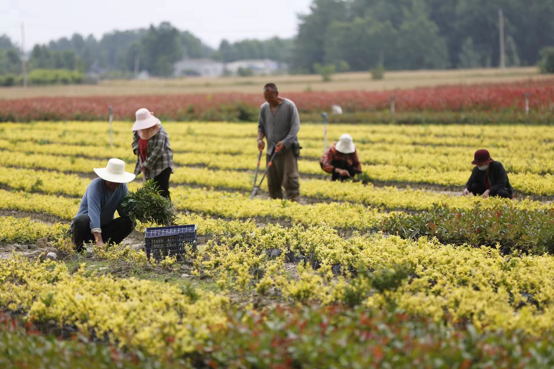 在位于老乐山脚下的驿城区胡庙乡藏集村青苗种植农民专业合作社,种植的一片片红、黄、绿的各类苗圃仍是一派火热的劳动场面,30多名村民正在这里挥锹铲土,修剪花木、拔草锄地、移栽花木干得热火朝天。远远望去整个苗圃基地宛如一幅生机勃勃、欣欣向荣的画卷。
