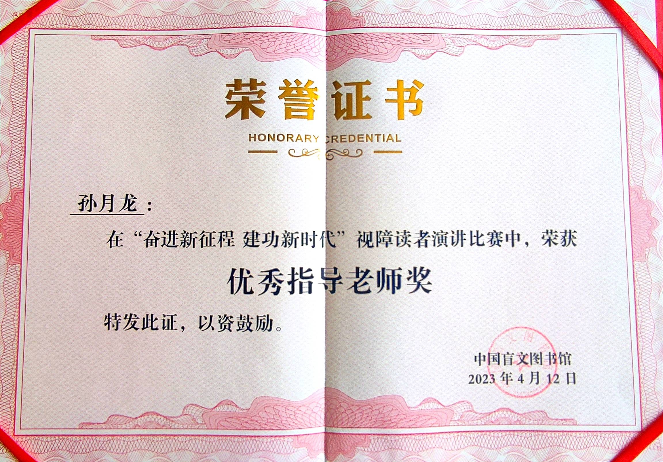 在“奋进新征程 建功新时代”视障读者演讲比赛中,荣获优秀指导老师奖