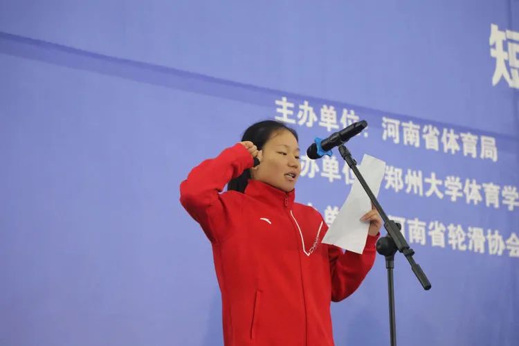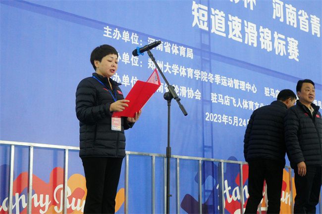 “奔跑吧·少年”2023年“体彩杯”河南省青少年短道速滑锦标赛开赛仪式由驻马店市卫健体委党组成员、副主任孟丽主持。
