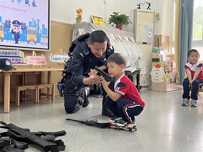 来自特巡警支队的宋虎带领小朋友们观看了机场特警宣传视频,使孩子们对特警的工作有了一定了解。 随后,宋虎叔叔又为小朋友展示了各式各样的警帽和长短不一的训练用枪模型,随着讲解不断深入,特警叔叔随身携带的单警装备引起了孩子们的好奇,利器穿不透的战术马甲、伸缩自如的警棍、玫瑰金色的手铐、警用肩灯、辣椒喷雾等警械装备的展示让幼儿们热情高涨,在一阵阵“哇塞!太酷啦!”得欢呼声中,孩子们对机场特警这一职业角色也有了更为全面的认知。
