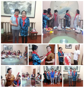 这一天上午,原定11点半集中,然而不少人按捺不住激动的心情,10点过后,与会的知青点战友已经差不多都集聚在一起,大厅内外三五成群的战友,相识的、新冠疫情期间久未谋面的,一个个仿佛都有着说不完的话语,互相倾诉着别后情谊。泉城著名画家、活动发起人之一的耿玉香大姐,借着“六一”国际儿童节之热潮,为每一位参会战友佩戴上鲜艳的红领巾,顷刻间,男女知青精神焕发,神采奕奕,仿佛又回到了几十年前充满着快乐的孩提岁月。