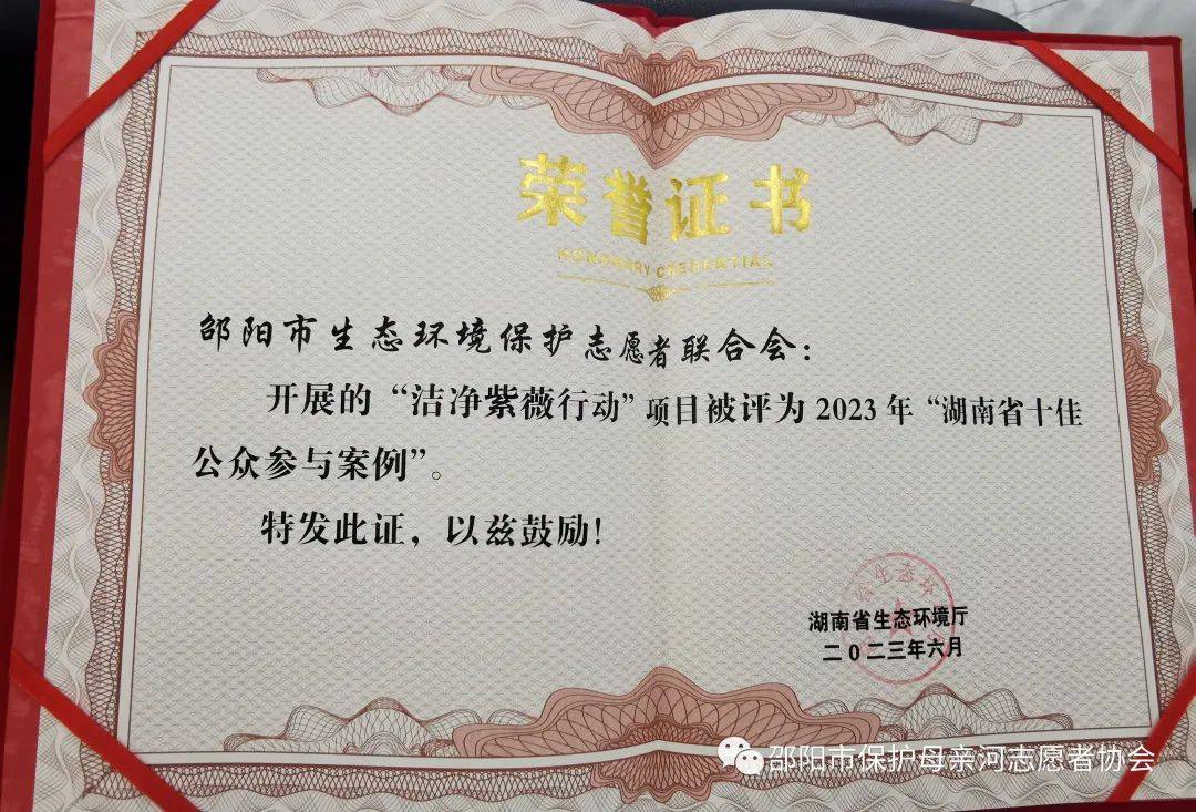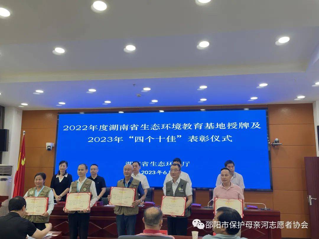 6月4日上午,湖南省2023年六五环境日建设和谐共生的现代化湖南主场活动在岳阳举行,邵阳市生态环境保护志愿者联合会"洁净紫薇行动"项目荣获湖南省2023年"十佳公众参与案例",该联合会秘书长胡浴明参加颁奖仪式。这是该联合会近两年来第三次荣获省级荣誉。