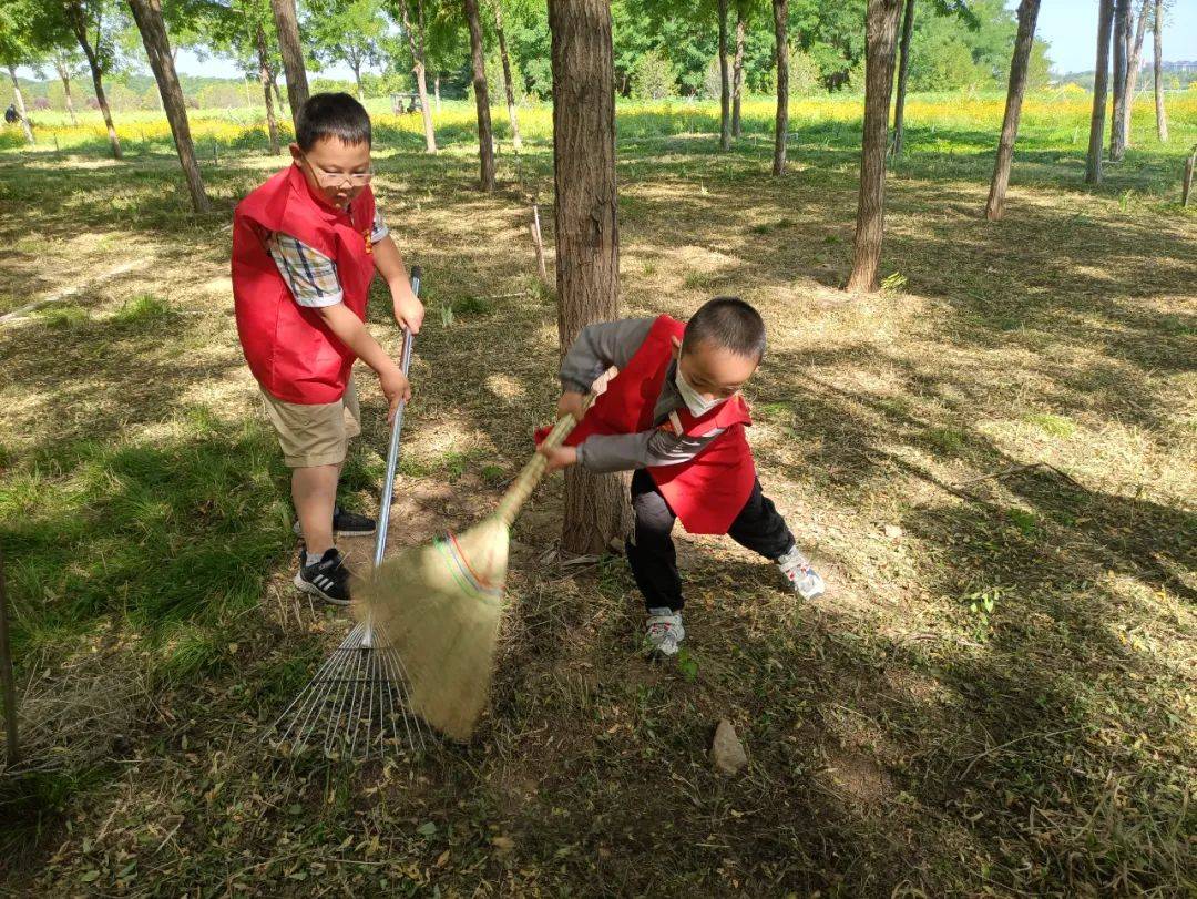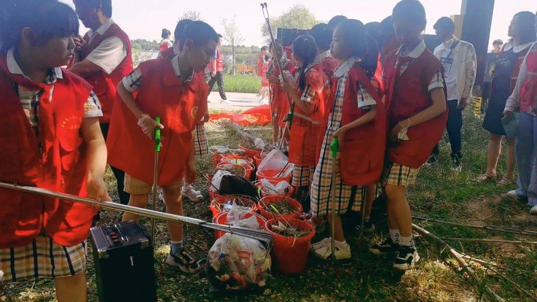 东马路小学和桥西区海棠苑幼儿园的小朋友们自带不锈钢夹子、塑料桶、编织袋等清扫工具,沿着二号区域周边捡拾垃圾,并把钓鱼垃圾、休闲垃圾、河岸垃圾、绿化带内的纸屑、塑料袋、饮料瓶、树叶、树枝清理后装入垃圾桶。