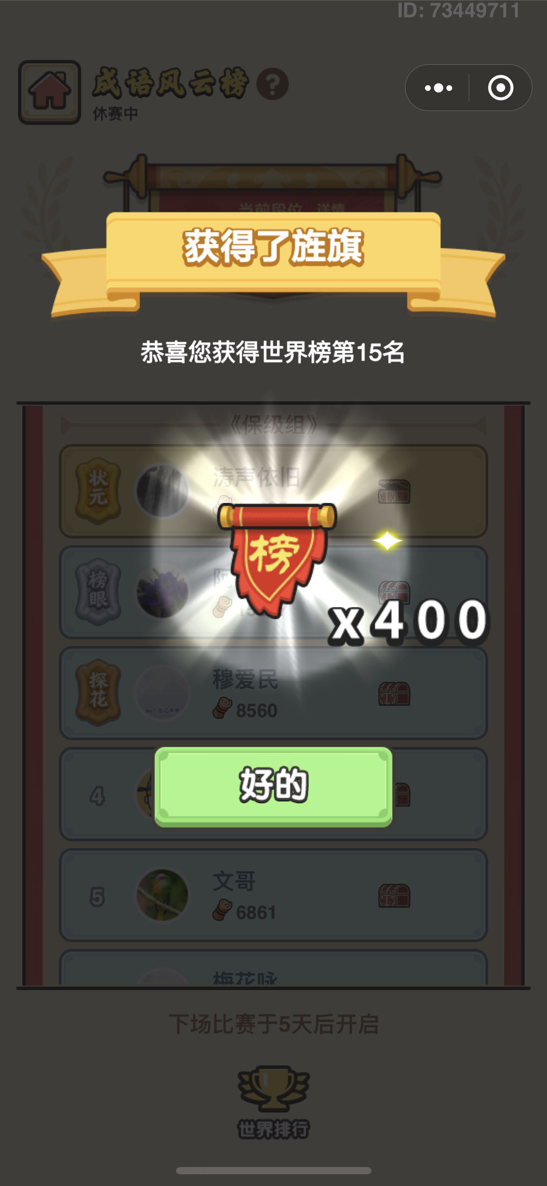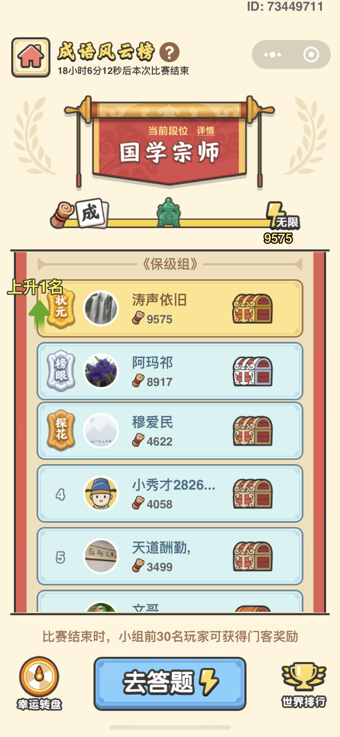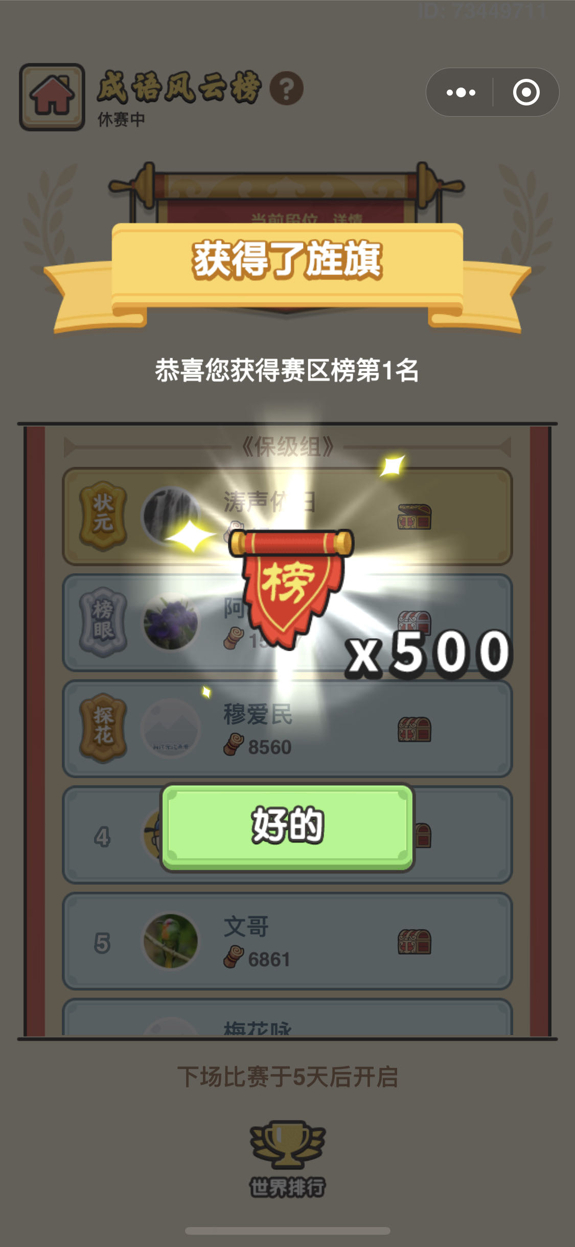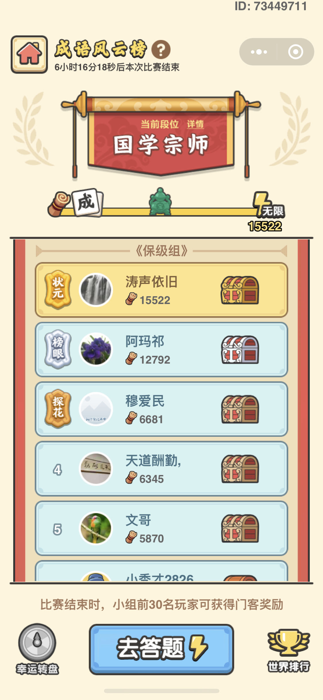 在6月17日成语风云榜大赛中,吾以17395之成绩获得了状元,但这次夺冠与往届不同,遇到了一个强劲对手,从第一天七点半我参赛起,(此次比赛时间是周五早六点起到周六晚十点止。因周四事多12点多才我睡觉,早晨起晚了)知耻而后勇,奋起直追,愈加珍惜每分每秒,到中午时才暂时站在 第一名位置,但第二名紧随其后,你追我赶,名次交替频繁,这引起我高度重视,他何方神圣?我点开其头像,才得知他曾获得成语风云榜大赛世界榜第8名,其所获旌旗高达9万多,我才5万多, 这说明其经常参加比赛,心理素质好,由此判定其绝不是等闲之辈,肯定是一位高手,其必然是我夺冠路上一只拦路虎。我有些担心,但同时也有些暗喜,有竞争才能有进步,决心坦然面对,迎接挑战,和其一决高低。办法总比困难多,我釆取了一小时一记录我俩比赛数,找出其中变化,通过数字比较,发现了其弱点,就是其每小时通关数和我相比少着80--100个数,透漏出其通关速度稍慢。艺不压身,通过数年磨练,我通关速度已突飞猛进。其短处就是我长处,为此大大提高了信心,决心放弃以往可以休息的时间,和其打持久战。