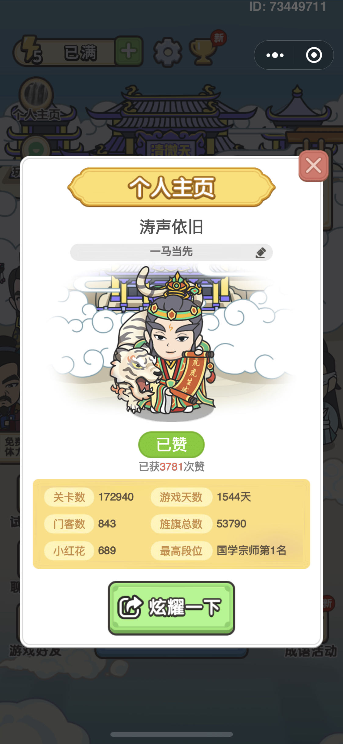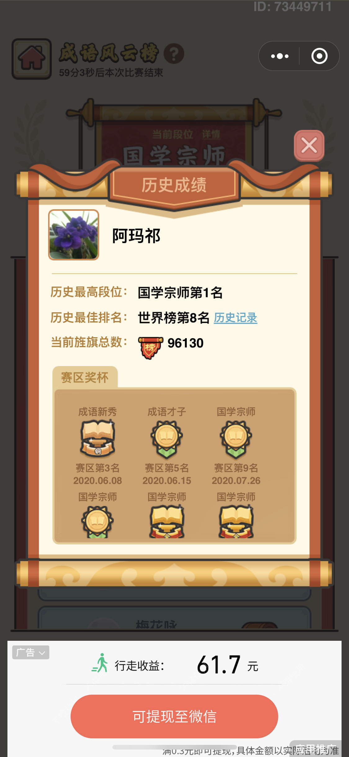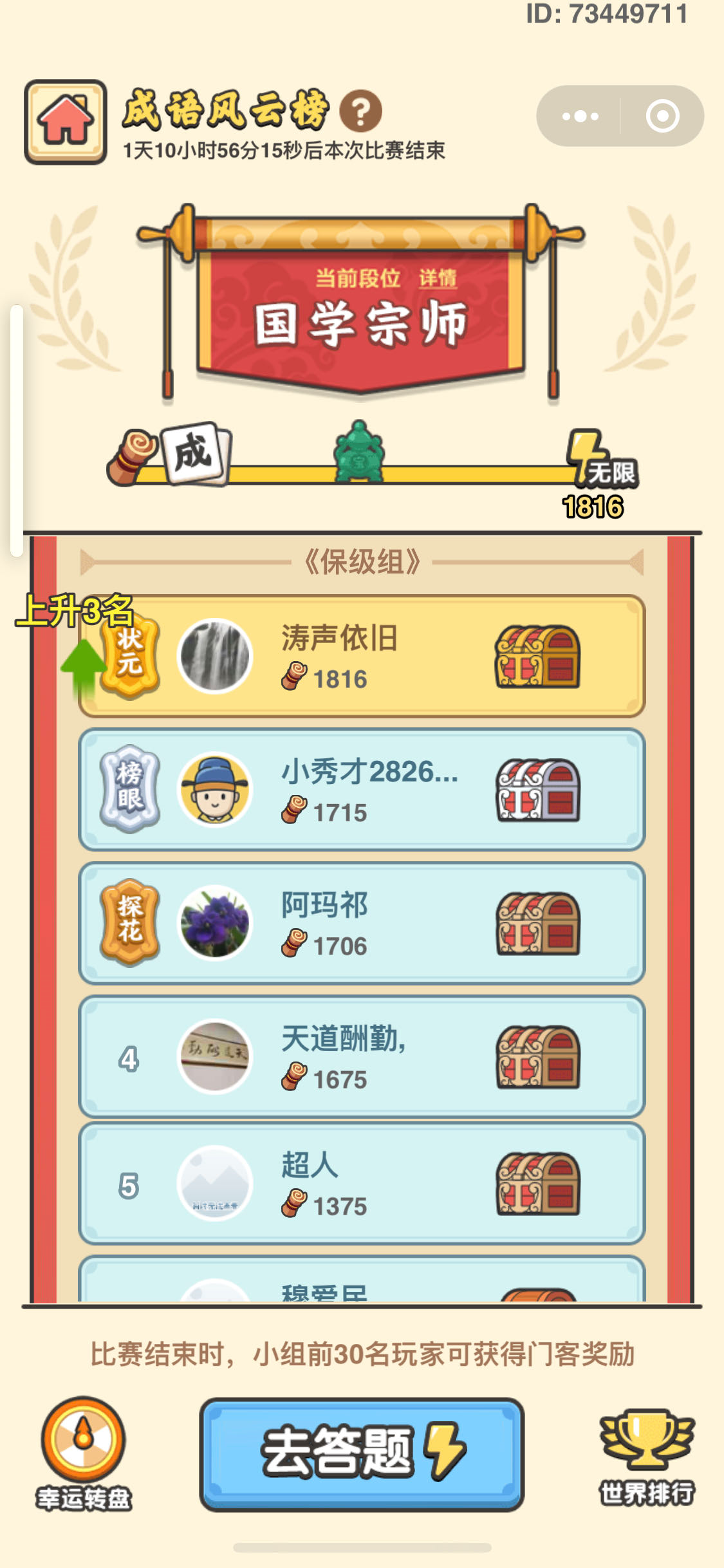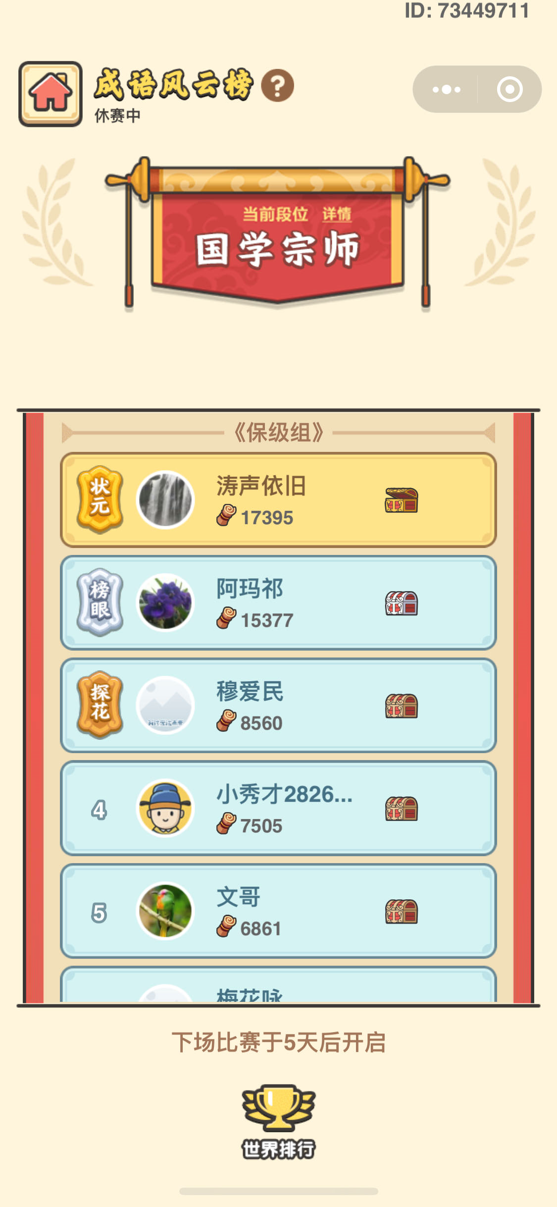 在6月17日成语风云榜大赛中,吾以17395之成绩获得了状元,但这次夺冠与往届不同,遇到了一个强劲对手,从第一天七点半我参赛起,(此次比赛时间是周五早六点起到周六晚十点止。因周四事多12点多才我睡觉,早晨起晚了)知耻而后勇,奋起直追,愈加珍惜每分每秒,到中午时才暂时站在 第一名位置,但第二名紧随其后,你追我赶,名次交替频繁,这引起我高度重视,他何方神圣?我点开其头像,才得知他曾获得成语风云榜大赛世界榜第8名,其所获旌旗高达9万多,我才5万多, 这说明其经常参加比赛,心理素质好,由此判定其绝不是等闲之辈,肯定是一位高手,其必然是我夺冠路上一只拦路虎。我有些担心,但同时也有些暗喜,有竞争才能有进步,决心坦然面对,迎接挑战,和其一决高低。办法总比困难多,我釆取了一小时一记录我俩比赛数,找出其中变化,通过数字比较,发现了其弱点,就是其每小时通关数和我相比少着80--100个数,透漏出其通关速度稍慢。艺不压身,通过数年磨练,我通关速度已突飞猛进。其短处就是我长处,为此大大提高了信心,决心放弃以往可以休息的时间,和其打持久战。