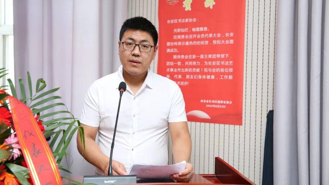 2023年6月23日上午,长安区书法家协会会员代表大会在金羚大厦胜利召开。长安区委宣传部副部长、区委文明办主任赵晓薇,长安区文联主席王江,区民政局副局长高亚慧出席会议,区作协、区文艺志愿者协会、区美协、区摄协负责同志到会庆贺,区书协主席团及会员代表一百余人参加会议。