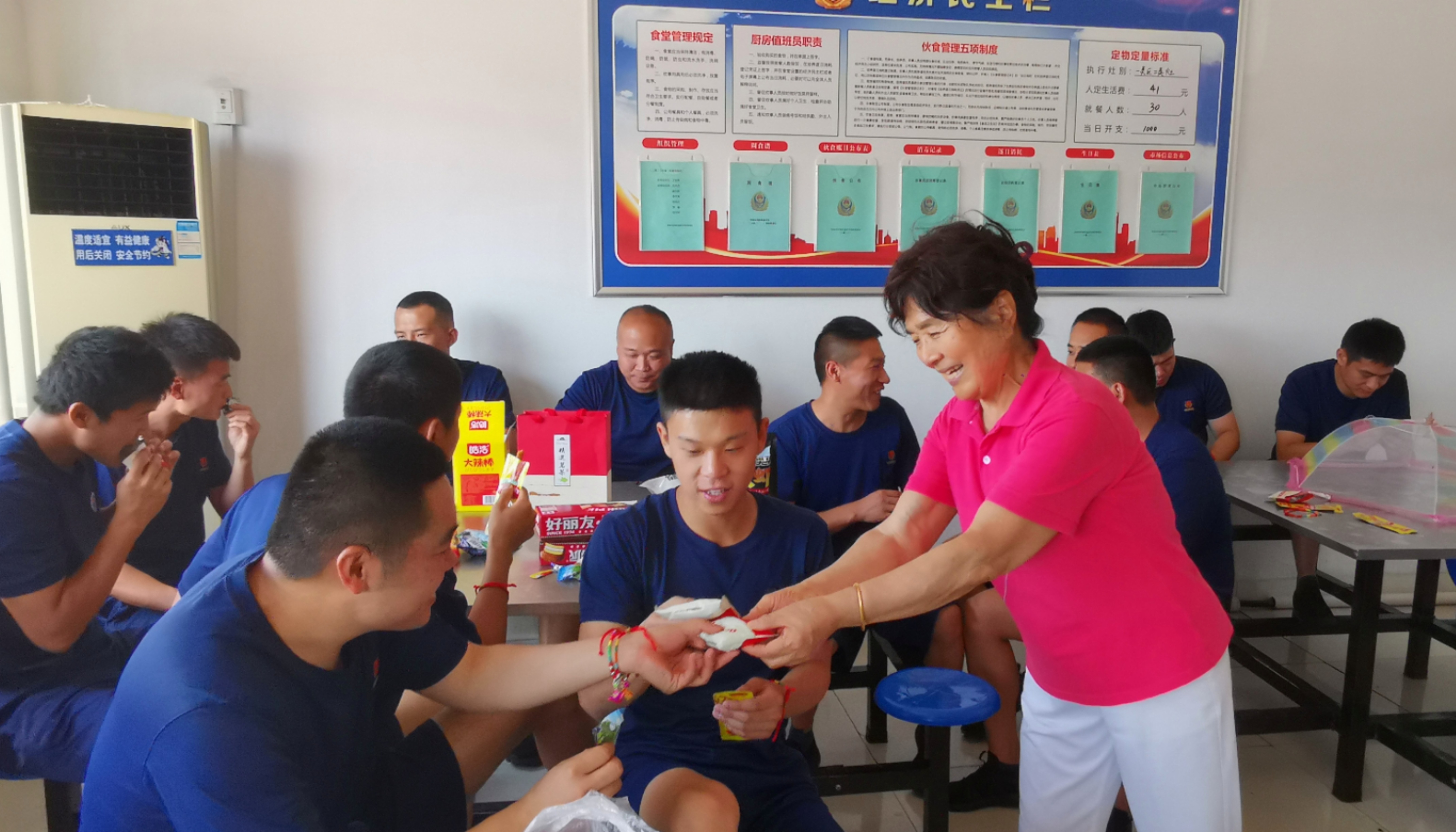 一个人总是在不经意间,回忆从前,儿时到了端午节这天,也许每个人都能想起母亲包粽子的情景,今天“兵妈妈”和老兵大哥带来了粽子,我想这弥漫了整个餐厅飘香的粽子,对孩子们来说也会是一个温暖的记忆,是“兵妈妈”的爱心、善心让远离父母,节日坚守岗位的孩子们,感到像回到了自己妈妈身边一样的温暖、不寂寞、不孤单。