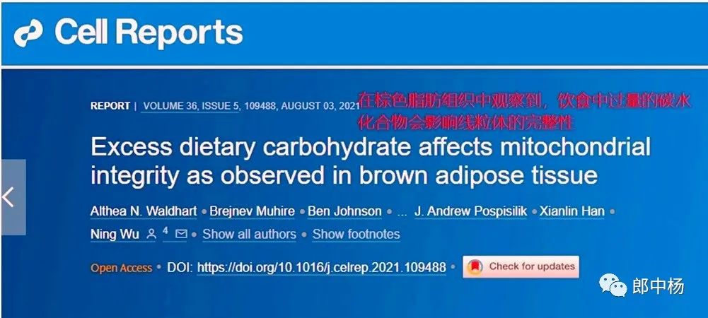 高碳水化合物饮食会使过多葡萄糖进入棕色脂肪细胞,从而使该细胞膜中多不饱和脂肪酸(Polyunsaturated Fatty Acid,PUFA)大量减少,影响压力条件下的线粒体完整性、电子传递链效率,最终导致线粒体热量输出大幅减少。PUFA在线粒体的钙稳态、基因表达和呼吸功能中发挥作用,并可减少线粒体ROS产生。在相关基因敲除的小鼠实验中,也证实了细胞中过多的葡萄糖会影响线粒体正常功能。过量碳水化合物引起的细胞损伤进一步转化为线粒体膜双层变化,也能影响该细胞器功能。郎中曾在神经细胞药理实验中进行过线粒体功能研究,认为上述观点有理论和实验基础。
