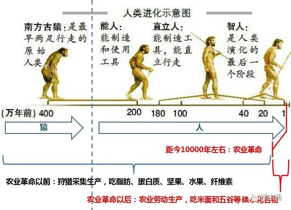 (2)“国人五千年”听起来时间好像很长了,但放在人类进化的历史长河中其实很微不足道。人类历史200多万年,在绝大多数时间里我们的远古祖先都是狩猎采集者。大约1万年前发生了席卷全球的“农业革命”,人类从狩猎采集者变成了农业劳动者开始种粮食。饮食结构也发生了相应变化开始吃主食,满打满算人类吃上主食也就1万年左右。饮食结构变化的速度远远大于人类身体进化的速度,慵懒的现代人正是在用原本适合狩猎采集的身体,大量吃着碳水化合物非常高的主食。这就导致了肥胖、湿疹、高血压、高血脂、高血糖、过敏、海默病等现代病层出不穷。全球主要经济体人口能吃饱饭最多不过100年,中国人能吃饱饭也就将近40年。正是最近这几十年随心所欲地享用高糖、高碳水化合物的原因,导致了全球范围内上述健康问题越发明显起来。