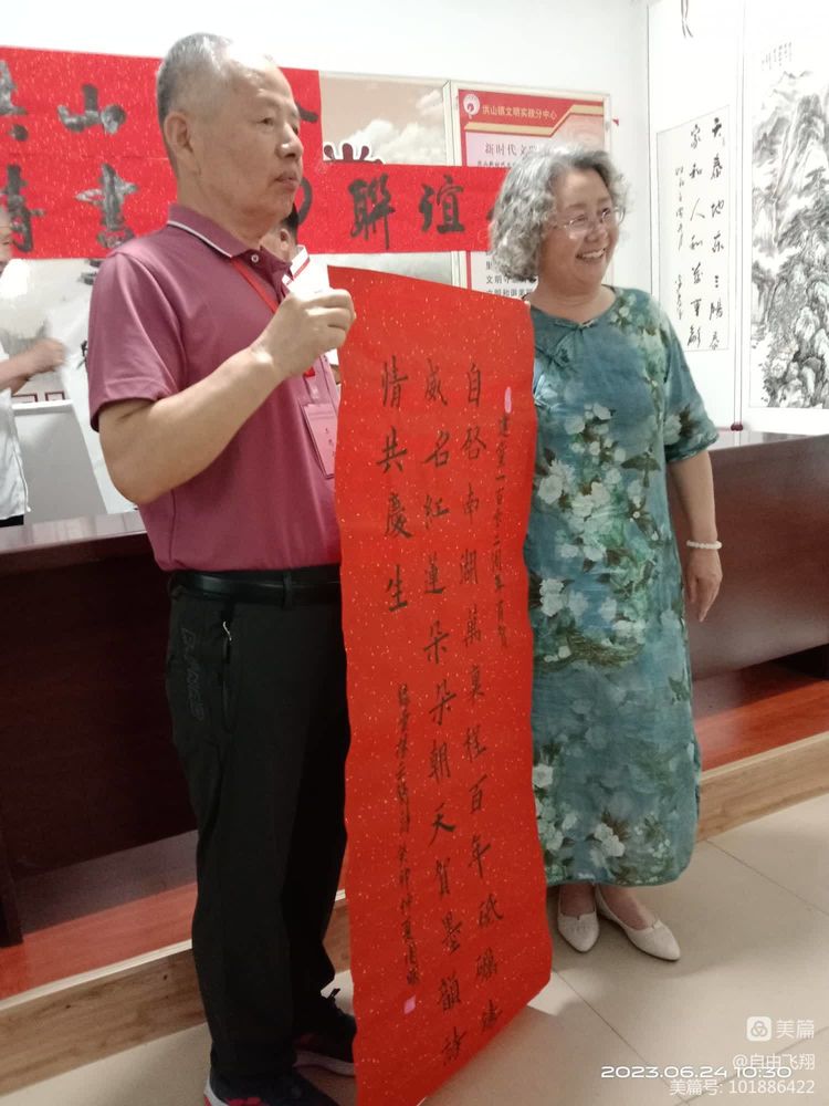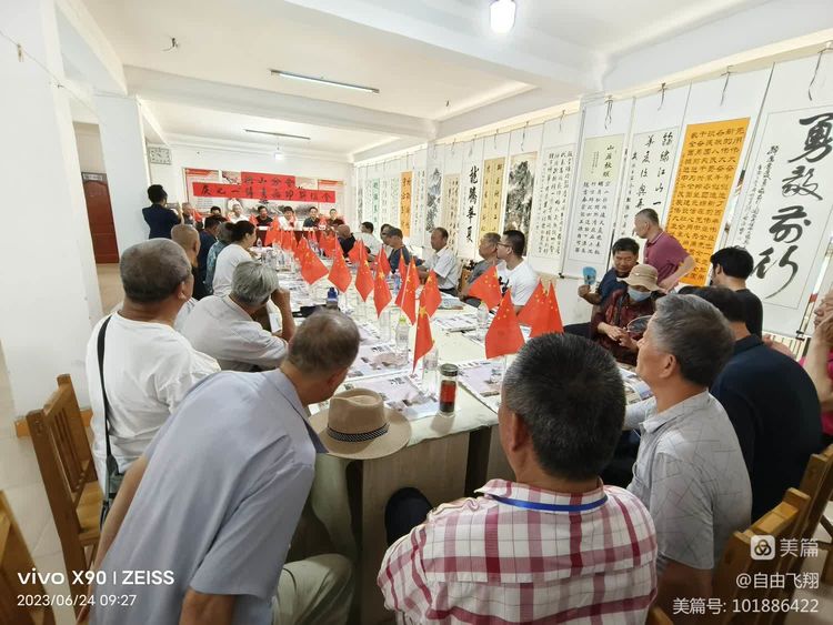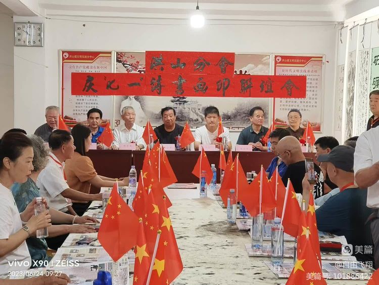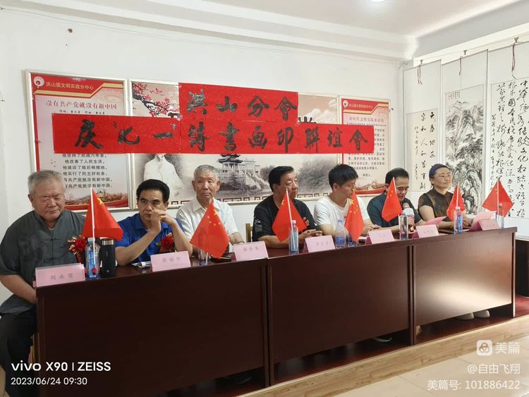 6月24日上午九点半,洪山镇文化站三楼会议室红旗飘飘,高朋满座,书画展品熠熠生辉,会议室洋溢着浓浓的节日气氛。洪山诗词分会与书画分会在这里组织联谊会,共同庆祝中国共产党的一百零二岁生日。