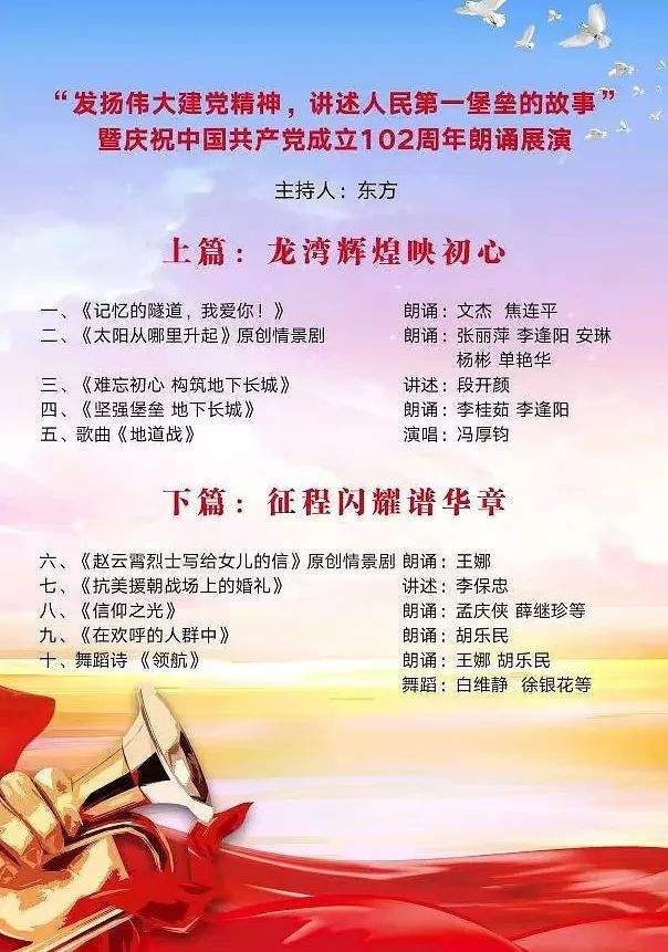 演出分为“龙湾辉煌映初心”和“征程闪耀谱华章”两个篇章,选取了以焦庄户为创作题材的《记忆的隧道,我爱你!》、《坚强堡垒 地下长城》等激荡人心的原创诗歌作品以及《赵云霄烈士写给女儿的信》、《在欢呼的人群中》等中华经典名篇,由中国著名朗诵家、表演艺术家、中国演诵艺术创始人胡乐民老师,全国十佳青年朗诵艺术家、顺义区文化馆王娜老师等领衔主演。演出通过情景剧朗诵、讲述、歌舞等多种艺术表现形式,传承红色基因,赓续红色血脉,讲好中国故事,牢记初心使命,为现场观众献上一场穿越时空的视听盛宴。