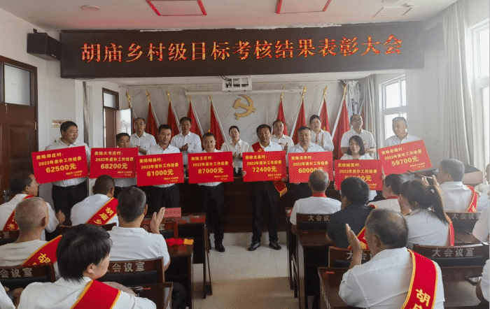 会上宣读了胡庙乡政府《关于对2022年村级目标考核结果表彰的决定》,对在村级目标考核、信访稳定、人居环境整治、殡葬改革、城乡基本医保征缴等工作中取得优异成绩的先进单位进行表彰,共评出红旗村3个、优秀村3个、良好村7个、重点管理村3个,根据各村工作实绩,发放了不同程度的以奖代补资金。