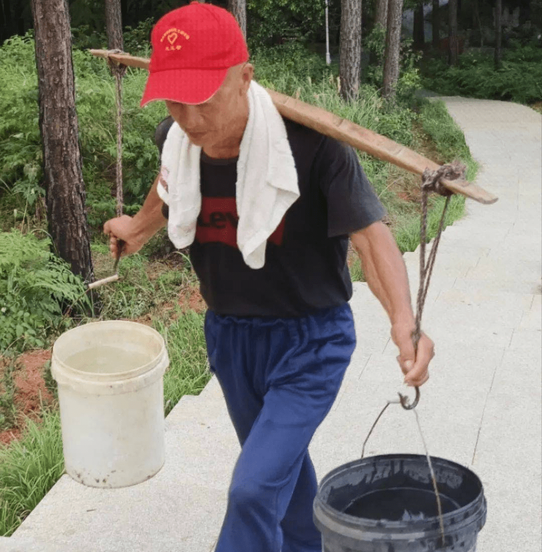 20亩山坡,挖荒锄草,谈何容易,说说尚可,做起来难呀!老苏天天坚持上山,三齿耙、十字镐、大瓶水、擦汗毛巾,一样都不少。他常说,不怕慢,就怕站,每天做一点,积少成多,成就可观。一身黝黑黝黑的皮肤,双手厚厚的老茧,见证了老苏对公益林的厚爱和付出。
