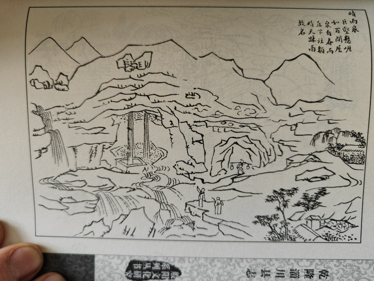 “滴水泉,县西二十八里。石穹隆如百间屋,苔结如龙首,泉自龙首悬泻而下,似百道玉柱,石池承之,流入涧壑为溪。一老衲云:‘迹遍九州未尝见也。’一名‘晴雨泉’,一名‘天雨泉’。”——由此知道,晴雨泉也叫滴水泉,还叫天雨泉。它在淄川城西面二十八里的滴水泉村,有百间房屋的石穹隆,而向外探出、顶上长满青苔的石头就像个龙头,泉水就是从龙头里悬泻而下,就像百道玉柱,可见水流之大。下有石池承接着这水,然后流到沟壑成为溪。有位老僧人说:‘我走遍九州还从未见过这种景象。’”可见晴雨泉的独特。