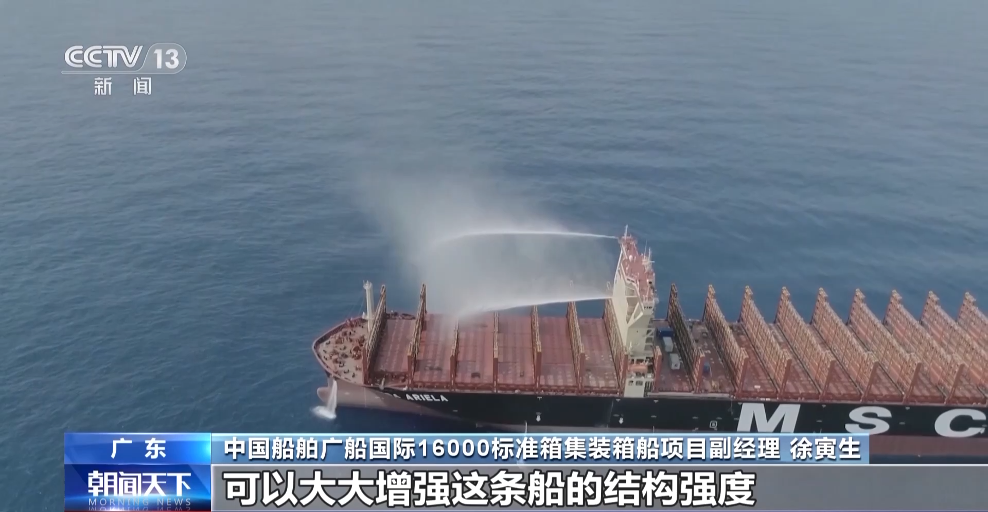 中国船舶广船国际16000标准箱集装箱船项目副经理 徐寅生:我们采用了85毫米厚的一个止裂钢,这个钢板是在箱船上面的一个特有的,因为箱船的结构要求比较高,通过这个85毫米厚的止裂钢,可以大大增强这条船的结构强度。