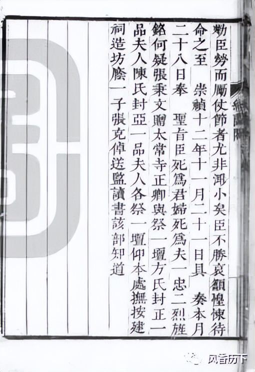 崇祯十二年十一月二十八日奉圣旨:臣死为君,妇死为夫。一忠二烈,旌銘何疑?张秉文赠太常寺正卿,与祭一坛。方氏封正一品夫人,陈氏封亚一品夫人,各祭一坛。仰本处抚按建祠造坊。