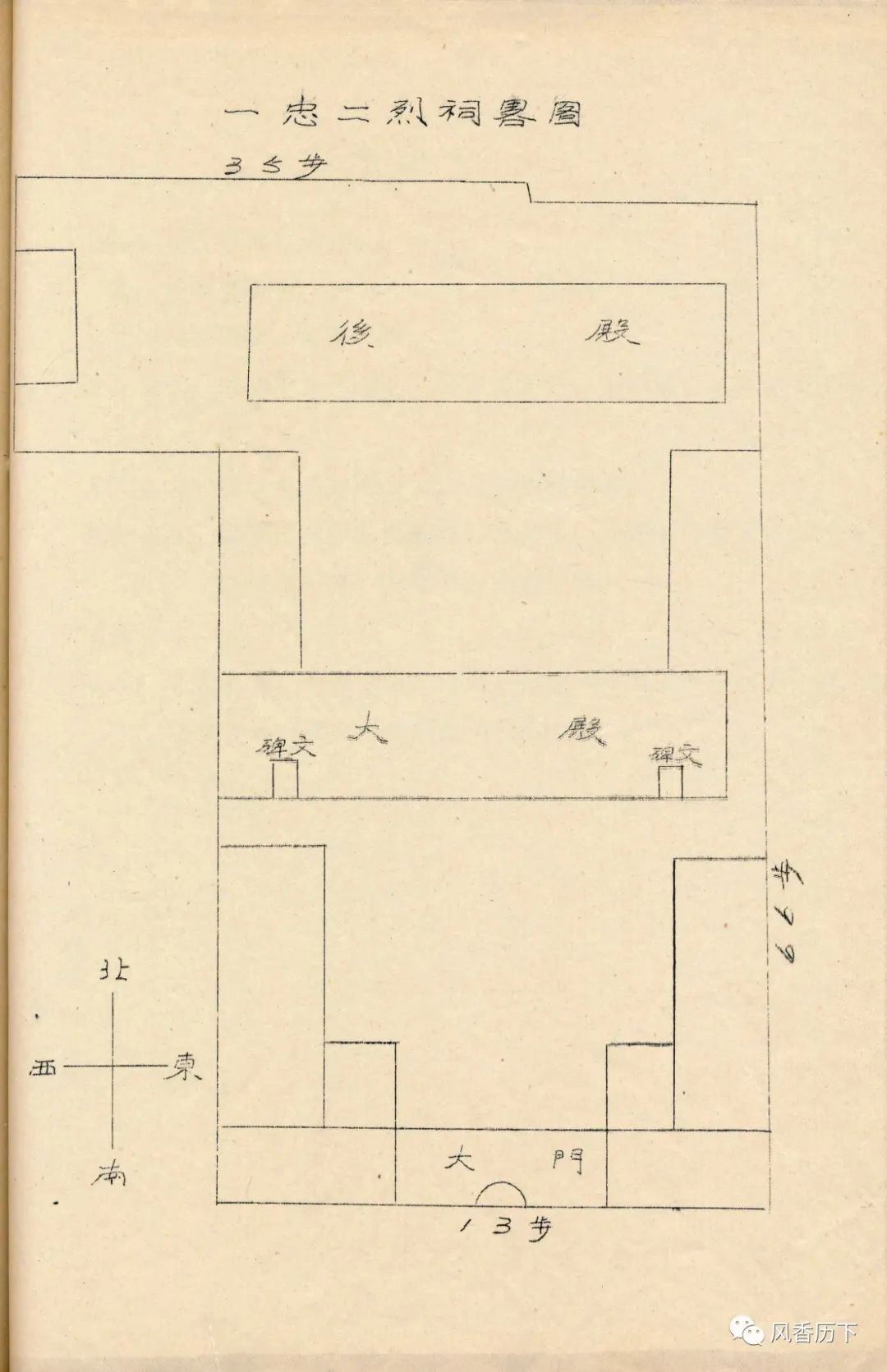 据图二,忠烈祠宽阔而宏伟,有大门、大殿、后殿构成,长达66步,而宽则为前13步、后35步。怪不得清代任弘远称张秉文“裔孙”能够“罢职寓内”、世代相守呢!