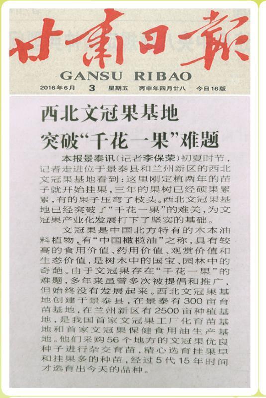 文冠果历来存在移栽成活难和"千花一果"等难题,西北文冠果基地从文冠果的"深根性"和"肉质根"这两个重要特性入手,利用控水育苗、药水泡根、泥浆蘸根和塑料包根等措施,解决了移栽成活难题;西北文冠果基地从全国56个地方购买了文冠果种子进行杂交育苗,发现哪一棵挂果早、挂果多就采下来,进行第二代育苗,一直进行了10代共23年时间,才培育出了高产文冠果种苗,从而为文冠果的产业化发展打下了坚实的基础。由此,西北文冠果基地被315授予全国重质量守信用联盟单位,被甘肃省农牧厅评为甘肃省省级农民专业合作社示范社。