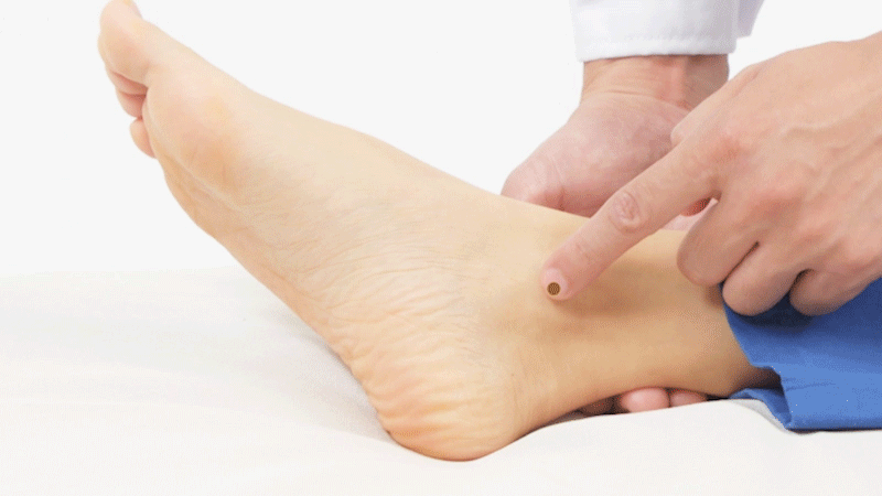 用针灸针直刺照海穴0.5-0.8寸,针刺时局部有强烈的酸胀感,可放射至脚踝部,可以缓解失眠、月经不调、尿路感染等。