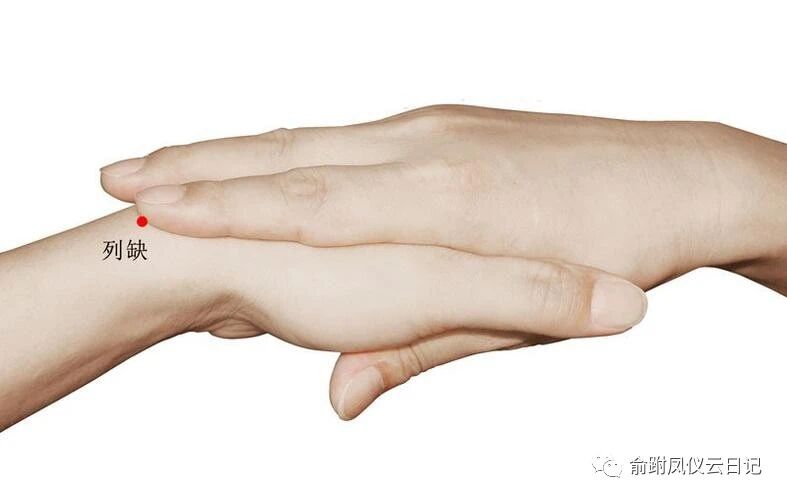 列缺穴位于前臂桡侧缘,桡骨茎突上方,腕横纹上1.5寸,当肱桡肌与拇长展肌腱之间;取穴时,两手虎口相交,一手食指压在另一手的桡骨茎突上,此时食指尖端下方的凹陷处即为列缺穴。