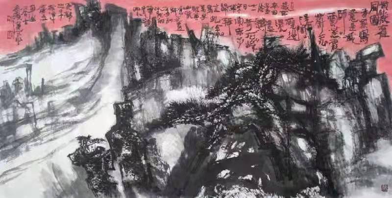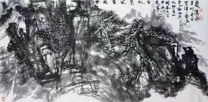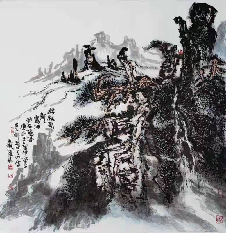 恩师石齐先生说:“艺术要点亮自家灯火,作品才有个性,才有价值。”山水画的各种皴法,都是画家们在师法自然中创立出来的,如“斧劈皴法”“折带皴法”“荷叶皴法”“乱麻皴法”“卷云皴法”“雨点皴法”“乱柴皴法”等。我在长期研究探索黄山山水画的创作中,师法自然,创研“万字皴法”,追求石齐老师提出的“三象合一”的大视觉画风,塑造意象山水画语境。 “万字皴法”,演变于徽派建筑“三雕”,即石雕、木雕、砖雕中的“万字钩”符号和周易太极图中的“阴阳鱼”符号,以书法笔墨塑造点、线、面并诠释写意的通透性,遵循“疏可走马,密不容针”的艺术理念。 我将在黄山山水画和徽州山水画创作中不断传承、创新。