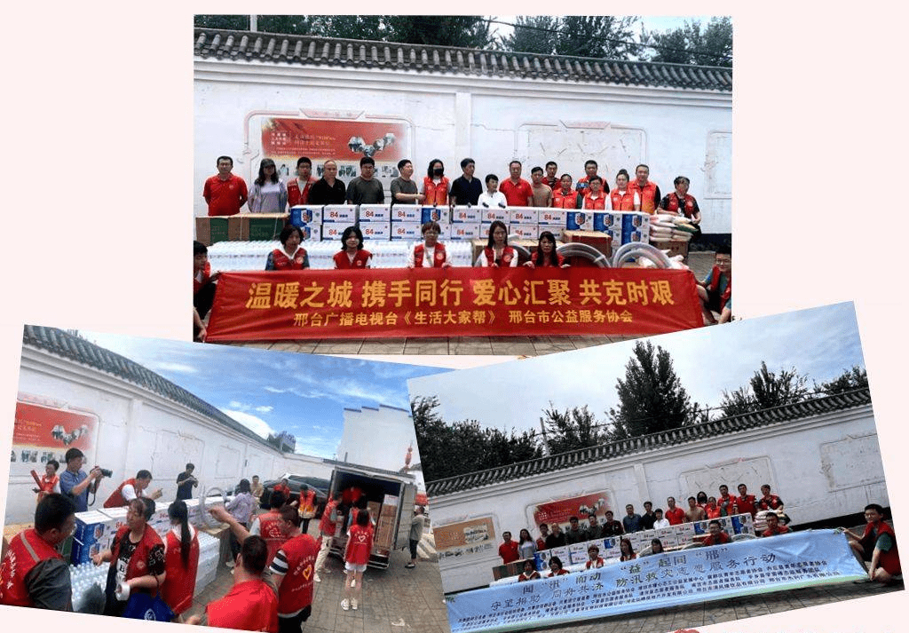2023年8月5日,共青团邢台市委、邢台市社会组织党委、共青团宁晋县委联合邢台市公益服务协会 、邢台广播电视台《生活大家帮》栏目、襄都区青年志愿者协会、内丘县青年志愿者协会、任泽区公益服务协会、平乡县公益服务协会、隆尧县公益服务协会、邢台市公益服务协会宁晋县志愿者服务队、清河县志愿者服务队,平乡县学雷峰志愿服务团队、河北古顺酿酒股份有限公司 、卡博特旭阳化工(邢台)有限公司、 蓝莓湾生物科技有限公司邢台市清风楼饮品有限公司,邢台市杰利广告有限公司等爱心单位,走进宁晋县开展闻“汛”而动“益”起同“邢” 守望相助 同舟共济 防汛救灾志愿服务行动。缓解受灾群众的生活困难,送去温暖和关怀。